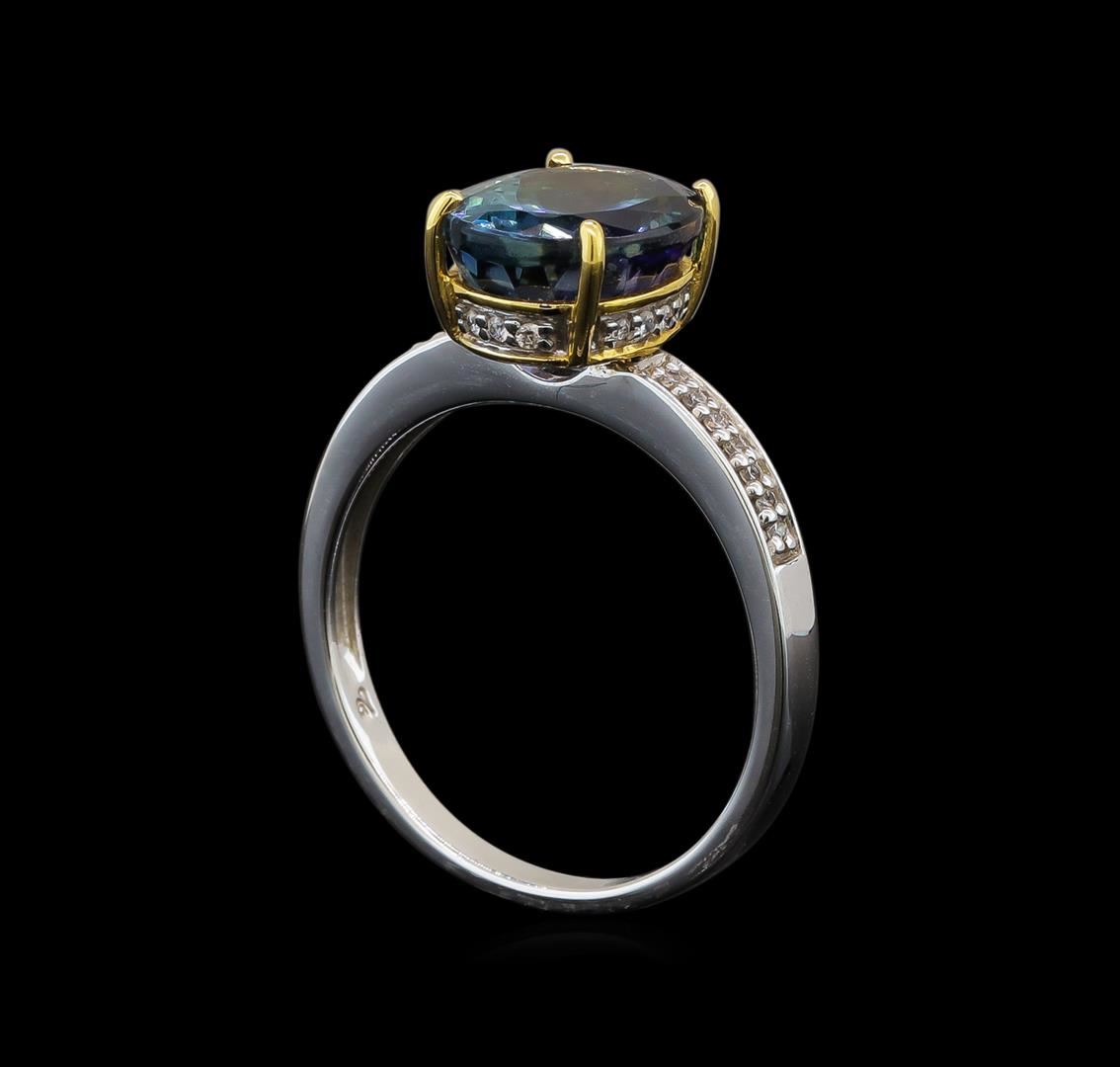 One electronically tested 18KT white and yellow gold ladies cast tanzanite and diamond ring with a bright polish finish. Identified with markings of "18K". Condition is new. Containing: One prong set oval modified brilliant cut natural tanzanite, measuring 10.00 x 8.20 x 5.33mm, approximate weight of 3.07ct., clarity is eye clean, type I, medium light, very slightly grayish, violet color, (GIA V 4/3), cut is good. Twenty-Eight prong set round brilliant cut diamonds, measuring 1.20 - 1.20 x 0.72mm (depth est.) approximate total weight of 28 Stones = 0.18ct. Clarity: I-1 to I-2. Color: I - J. Colored gemstones are presumed to have been subjected to commonly used enhancement processes. All diamonds and colored gemstones are graded in the mounting, unless otherwise stated. Total Weight of Colored Stones 3.07ct. Total Weight of Diamonds 0.18ct. Total Weight of Ring 4.30 grams. GGL Appraised at $2,955.00.