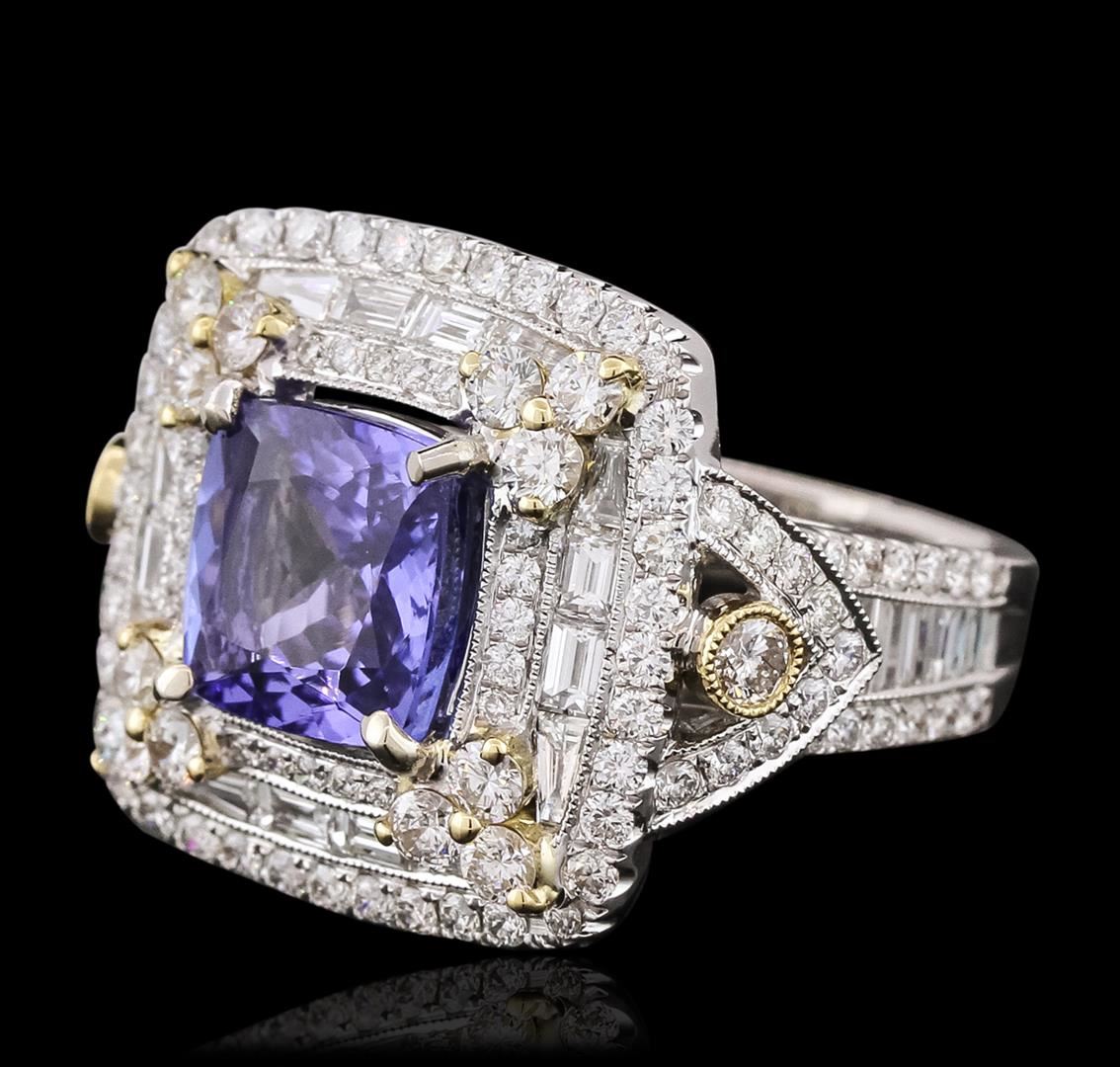 One electronically tested 18KT white and yellow gold ladies combination cast & assembled tanzanite and diamond ring with a flat shank with a bright polish finish. Identified with markings of "18K". Condition is new. Containing: One prong set square cushion modified brilliant cut natural tanzanite, measuring 8.96 x 8.92 x 5.08mm, approximate weight of 3.20ct., clarity is eye clean, type I, medium, very slightly grayish, violet color, (GIA V 5/3), cut is good. Two bezel set round brilliant cut diamonds, measuring 2.90 - 2.90 x 1.74mm (depth est.) approximate total weight of 2 Stones = 0.18ct. Clarity: SI-1 to SI. Color: L, Cut is Good. Twelve prong set round brilliant cut diamonds, measuring 2.20 - 2.20 x 1.32mm (depth est.) approximate total weight of 12 Stones = 0.47ct. Clarity: SI-1. Color: L, Cut is Good. One Hundred prong set round brilliant cut diamonds, measuring 1.30 - 1.20 x 0.75mm (depth est.) approximate total weight of 100 Stones = 0.71ct. Clarity: SI-1 to I-1. Color: I - J, Cut is Good. Twenty-Eight channel set baguette cut diamonds, measuring from 2.00 x 1.20 x 1.02mm (depth est.) to 3.00 x 1.50 x 1.28mm (depth est.) approximate total weight of 28 Stones = 0.99ct. Clarity: VS-2 to SI-1. Color: I - J, Cut is Good. Colored gemstones are presumed to have been subjected to commonly used enhancement processes. All diamonds and colored gemstones are graded in the mounting, unless otherwise stated. Total Weight of Colored Stones 3.20ct. Total Weight of Diamonds 2.35ct. Total Weight of Ring 12.90 grams. GGL Appraised at $16,045.00.