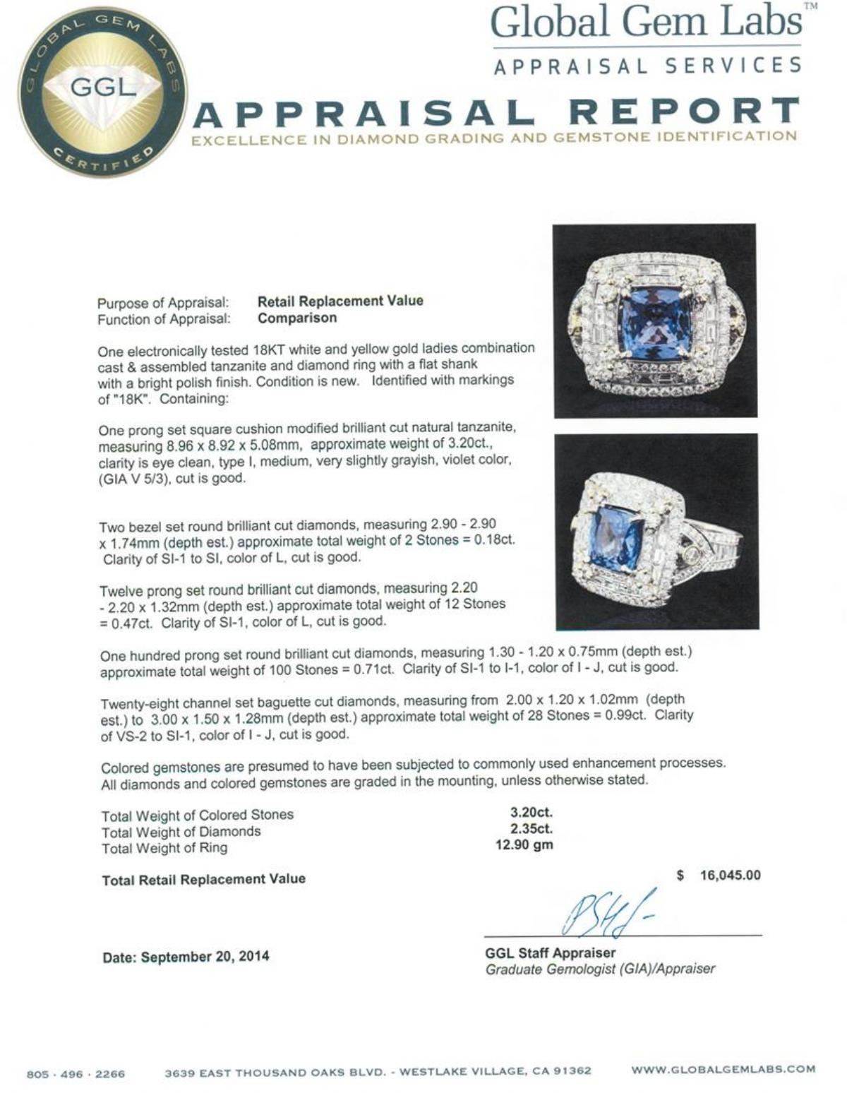 One electronically tested 18KT white and yellow gold ladies combination cast & assembled tanzanite and diamond ring with a flat shank with a bright polish finish. Identified with markings of "18K". Condition is new. Containing: One prong set square cushion modified brilliant cut natural tanzanite, measuring 8.96 x 8.92 x 5.08mm, approximate weight of 3.20ct., clarity is eye clean, type I, medium, very slightly grayish, violet color, (GIA V 5/3), cut is good. Two bezel set round brilliant cut diamonds, measuring 2.90 - 2.90 x 1.74mm (depth est.) approximate total weight of 2 Stones = 0.18ct. Clarity: SI-1 to SI. Color: L, Cut is Good. Twelve prong set round brilliant cut diamonds, measuring 2.20 - 2.20 x 1.32mm (depth est.) approximate total weight of 12 Stones = 0.47ct. Clarity: SI-1. Color: L, Cut is Good. One Hundred prong set round brilliant cut diamonds, measuring 1.30 - 1.20 x 0.75mm (depth est.) approximate total weight of 100 Stones = 0.71ct. Clarity: SI-1 to I-1. Color: I - J, Cut is Good. Twenty-Eight channel set baguette cut diamonds, measuring from 2.00 x 1.20 x 1.02mm (depth est.) to 3.00 x 1.50 x 1.28mm (depth est.) approximate total weight of 28 Stones = 0.99ct. Clarity: VS-2 to SI-1. Color: I - J, Cut is Good. Colored gemstones are presumed to have been subjected to commonly used enhancement processes. All diamonds and colored gemstones are graded in the mounting, unless otherwise stated. Total Weight of Colored Stones 3.20ct. Total Weight of Diamonds 2.35ct. Total Weight of Ring 12.90 grams. GGL Appraised.