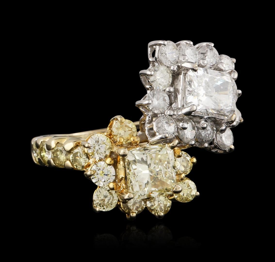 One electronically tested 18KT white and yellow gold ladies cast diamond ring with a bright polish finish. Identified with markings of "18K". Condition is new. Containing: One prong set radiant shaped cut diamond, measuring 6.80 x 5.00. x 3.50mm (depth est.) approximate weight of 0.98ct. Clarity: I-2. Color: H, Cut is Good. One prong set radiant shaped cut diamond, measuring 5.30 x 5.30 x 3.98mm (depth est.) approximate weight of 0.92ct. Clarity: I-1, Cut is Good. Seventeen prong set round brilliant cut diamonds, measuring 2.50 - 2.50 x 1.50mm (depth est.) approximate total weight of 17 Stones = 0.97ct. Clarity: I-1. Color: H - I, Cut is Good. Twelve prong set round brilliant cut diamonds, measuring 2.50 - 2.50 x 1.50mm (depth est.) approximate total weight of 12 Stones = 0.69ct. Clarity: SI-1 to SI-2, Cut is Good. All diamonds are graded in the mounting, unless otherwise stated. Total Weight of Diamonds 3.55ct. Total Weight of Ring 5.60 grams. GGL Appraised at $11,645.00.