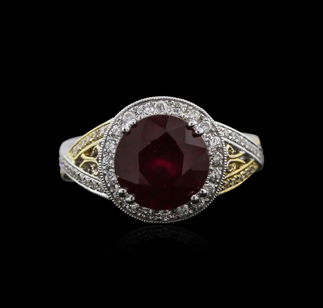 One electronically tested 18KT white and yellow gold ladies cast ruby and diamond ring with a bright polish finish. Identified with markings of "18K". Condition is new. Containing: One prong set round modified brilliant cut natural ruby, measuring 9.40 - 9.40 x 6.50 mm, approximate weight of 4.65ct., clarity is heavily included, medium dark, very slightly brownish, strongly purplish red color, (GIA stpR 6/3), cut is good. Sixty-Seven prong set round brilliant cut diamonds, measuring 1.30 - 1.20 x 0.75mm (depth est.) approximate total weight of 67 Stones = 0.48ct. Clarity: SI-2 to I-1. Color: H - I, Cut is Good. Colored gemstones are presumed to have been subjected to commonly used enhancement processes. All diamonds and colored gemstones are graded in the mounting, unless otherwise stated. Total Weight of Colored Stones 4.65ct. Total Weight of Diamonds 0.48ct. Total Weight of Ring 9.10 grams. GGL Appraised at $4,275.00.