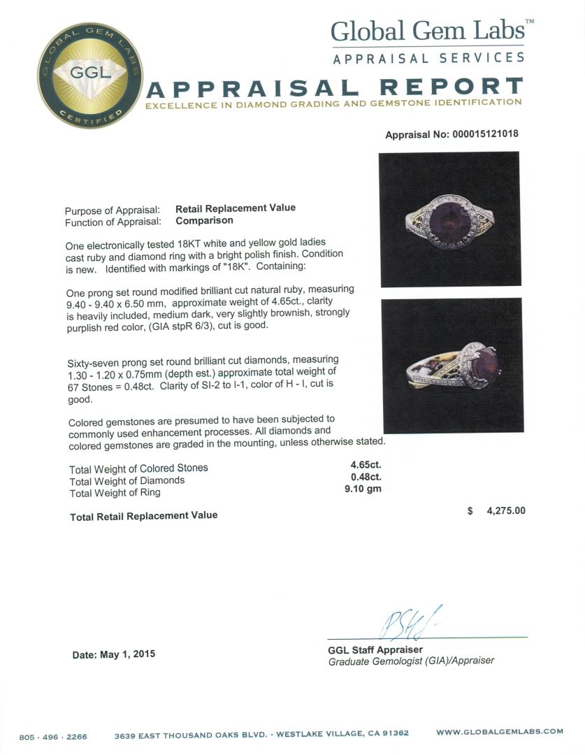 One electronically tested 18KT white and yellow gold ladies cast ruby and diamond ring with a bright polish finish. Identified with markings of "18K". Condition is new. Containing: One prong set round modified brilliant cut natural ruby, measuring 9.40 - 9.40 x 6.50 mm, approximate weight of 4.65ct., clarity is heavily included, medium dark, very slightly brownish, strongly purplish red color, (GIA stpR 6/3), cut is good. Sixty-Seven prong set round brilliant cut diamonds, measuring 1.30 - 1.20 x 0.75mm (depth est.) approximate total weight of 67 Stones = 0.48ct. Clarity: SI-2 to I-1. Color: H - I, Cut is Good. Colored gemstones are presumed to have been subjected to commonly used enhancement processes. All diamonds and colored gemstones are graded in the mounting, unless otherwise stated. Total Weight of Colored Stones 4.65ct. Total Weight of Diamonds 0.48ct. Total Weight of Ring 9.10 grams. GGL Appraised at $4,275.00.