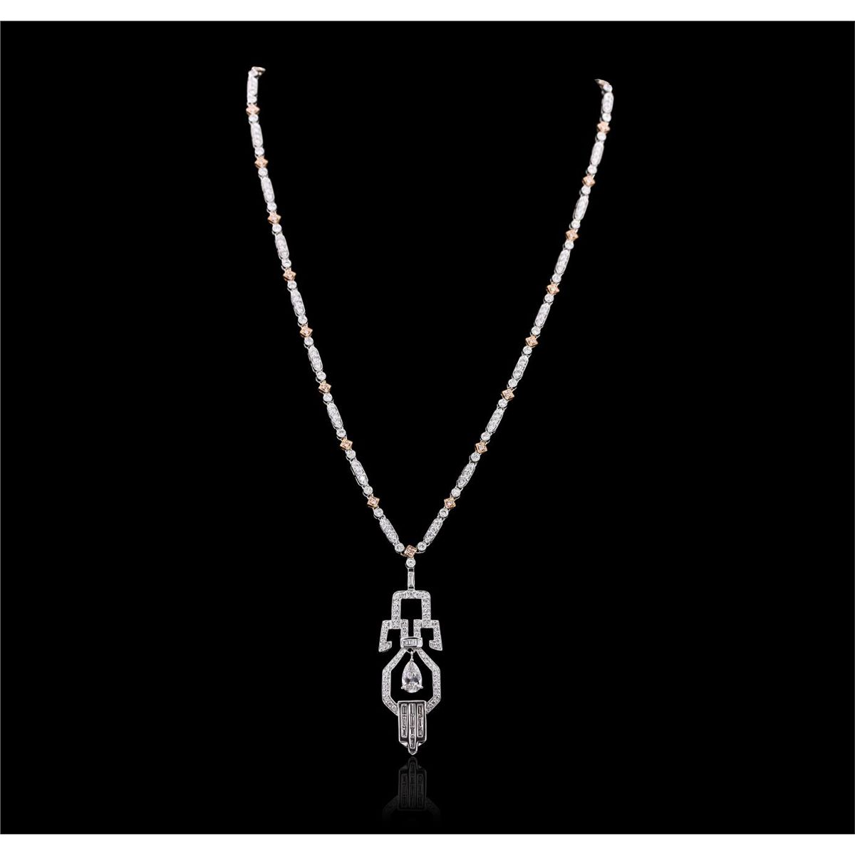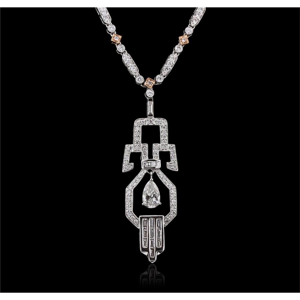 One electronically tested 18KT white and rose gold ladies cast & assembled diamond necklace. Sixteen and one-half inch necklace features a pendant consisting of a floating diamond set within a geometric diamond lattice supported by a flexible diamond ribbon, terminating in a concealed clasp with safety bar. Bright polish finish with milgrain detailing. Identified with markings of "18K".The necklace is reminiscent of the jewelry designs from the Art Deco Period. The Paris Exposition of Decorative Arts and Modern Manufacturers in 1925 gave the movement its name. The Art Deco Period is characterized with jewelry designs composed of bold geometric designs, & cubism. Condition is new, good workmanship. Containing: One prong set pear shaped cut diamond, measuring 8.20 x 5.00 x 2.90mm (depth est.) approximate weight of 0.75ct. Graded in the setting. Clarity: VS-2. Color: G Fifteen channel set baguette cut diamonds approximate total weight of 15 Stones = 0.70ct. Graded in the setting. Clarity: VVS-1 to VVS-2 Color F - H One Hundred Seventy-Five bead & bezel set round brilliant cut diamonds approximate total weight of 175 Stones = 3.07ct. Graded in the setting. Clarity: VVS-2 to VS-2. Color: F - H Twenty-Three bead set round brilliant cut diamonds approximate total weight of 23 Stones = 0.27ct. Faint pink secondary color throughout. Graded in the setting. Clarity: VS-1 to SI-1. Color: J - K. Total Weight of Diamonds 4.79ct. Total Weight of Necklace 19.90 grams. AIG Appraised at $29,275.00.