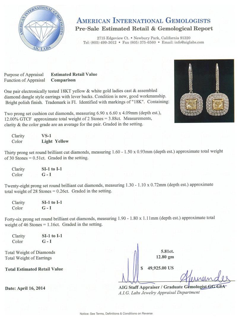 One pair electronically tested 18KT yellow & white gold ladies cast & assembled diamond dangle style earrings with lever backs. Condition is new, good workmanship. Bright polish finish. Trademark is FI. Identified with markings of "18K". Containing: Two prong set cushion cut diamonds, measuring 6.90 x 6.60 x 4.09mm (depth est.), 12.00.%. GTCF approximate. Total Weight of 2 Stones = 3.88ct. Measurements, clarity & the color grade are an average for the pair. Graded in the setting. Clarity: VS-1 Thirty prong set round brilliant cut diamonds, measuring 1.60 - 1.50 x 0.93mm (depth est.) approximate. Total Weight of 30 Stones = 0.51ct. Graded in the setting. Clarity: SI-1 to I-1. Color: G - I Twenty-Eight prong set round brilliant cut diamonds, measuring 1.30 - 1.10 x 0.72mm (depth est.) approximate. Total Weight of 28 Stones = 0.26ct. Graded in the setting. Clarity: SI-1 to I-1. Color: G - I Forty-Six prong set round brilliant cut diamonds, measuring 1.90 - 1.80 x 1.11mm (depth est.) approximate. Total Weight of 46 Stones = 1.16ct. Graded in the setting. Clarity: SI-1 to I-1. Color: G - I. Total Weight of Diamonds 5.81ct. Total Weight of Earrings 12.80 grams. AIG Appraised.