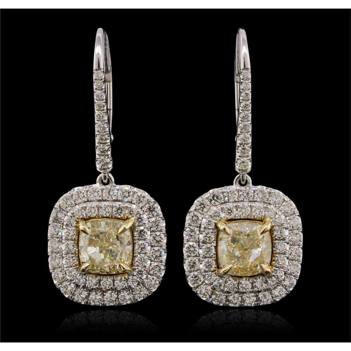 One pair electronically tested 18KT yellow & white gold ladies cast & assembled diamond dangle style earrings with lever backs. Condition is new, good workmanship. Bright polish finish. Trademark is FI. Identified with markings of "18K". Containing: Two prong set cushion cut diamonds, measuring 6.90 x 6.60 x 4.09mm (depth est.), 12.00.%. GTCF approximate. Total Weight of 2 Stones = 3.88ct. Measurements, clarity & the color grade are an average for the pair. Graded in the setting. Clarity: VS-1 Thirty prong set round brilliant cut diamonds, measuring 1.60 - 1.50 x 0.93mm (depth est.) approximate. Total Weight of 30 Stones = 0.51ct. Graded in the setting. Clarity: SI-1 to I-1. Color: G - I Twenty-Eight prong set round brilliant cut diamonds, measuring 1.30 - 1.10 x 0.72mm (depth est.) approximate. Total Weight of 28 Stones = 0.26ct. Graded in the setting. Clarity: SI-1 to I-1. Color: G - I Forty-Six prong set round brilliant cut diamonds, measuring 1.90 - 1.80 x 1.11mm (depth est.) approximate. Total Weight of 46 Stones = 1.16ct. Graded in the setting. Clarity: SI-1 to I-1. Color: G - I. Total Weight of Diamonds 5.81ct. Total Weight of Earrings 12.80 grams. AIG Appraised at $49,925.00.
