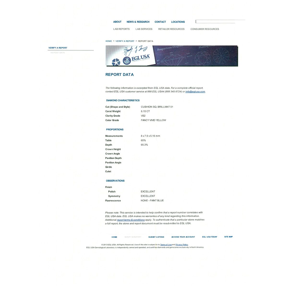 One pair electronically tested 18KT white and yellow gold ladies cast & assembled diamond dangle earrings with lever backs. Bright polish finish. Condition is new, good workmanship. Containing: Two prong set cushion cut diamonds, measuring 8.00 x 7.90 x 5.16mm approximate. Total Weight of 2 Stones = 6.15ct. EGL Report attached. Graded in the EGL Laboratory Report #US 911762108D. Clarity: VS-2 Forty-Four prong set round brilliant cut diamonds approximate. Total Weight of 44 Stones = 0.98ct. Graded in the setting. Clarity: VVS-1 to VS-1. Color: F - H. Total Weight of Diamonds 7.13ct. Total Weight of Earrings 7.20gm. AIG Appraised at $129,950.00.