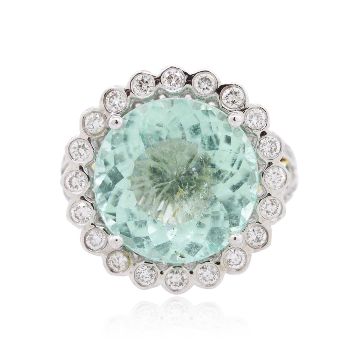 One electronically tested 18KT white and yellow gold ladies combination cast & assembled tourmaline and diamond ring with a bright polish finish. Identified with markings of "18K". Condition is new. Containing: One prong set round modified mixed cut natural paraiba tourmaline, measuring 12.98 - 13.02 x 8.45 mm, approximate weight of 8.71ct., clarity is moderately included, light, very slightly grayish, bluish green color, (GIA bG 3/3), cut is good. One Hundred Forty-Eight prong set round brilliant cut diamonds, measuring 1.50 - 1.00 x 0.75mm (depth est.) approximate total weight of 148 Stones = 1.05ct. Clarity: SI-2 to I-2. Color: I - J, Cut is Good. Six bead set round modified brilliant cut natural paraiba tourmalines, measuring 1.30 - 1.30 x 0.85 mm, approximate total weight of 0.06ct., clarity is heavily included, medium light, moderately strong, bluish green color, (GIA bG 4/4), cut is good. Colored gemstones are presumed to have been subjected to commonly used enhancement processes. All diamonds and colored gemstones are graded in the mounting, unless otherwise stated. Total Weight of Colored Stones 8.77ct. Total Weight of Diamonds 1.05ct. Total Weight of Ring 9.10 grams. GGL Appraised at $39,165.00.