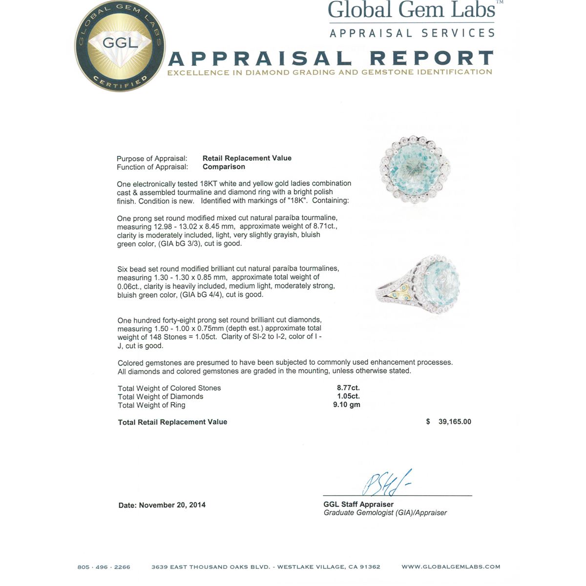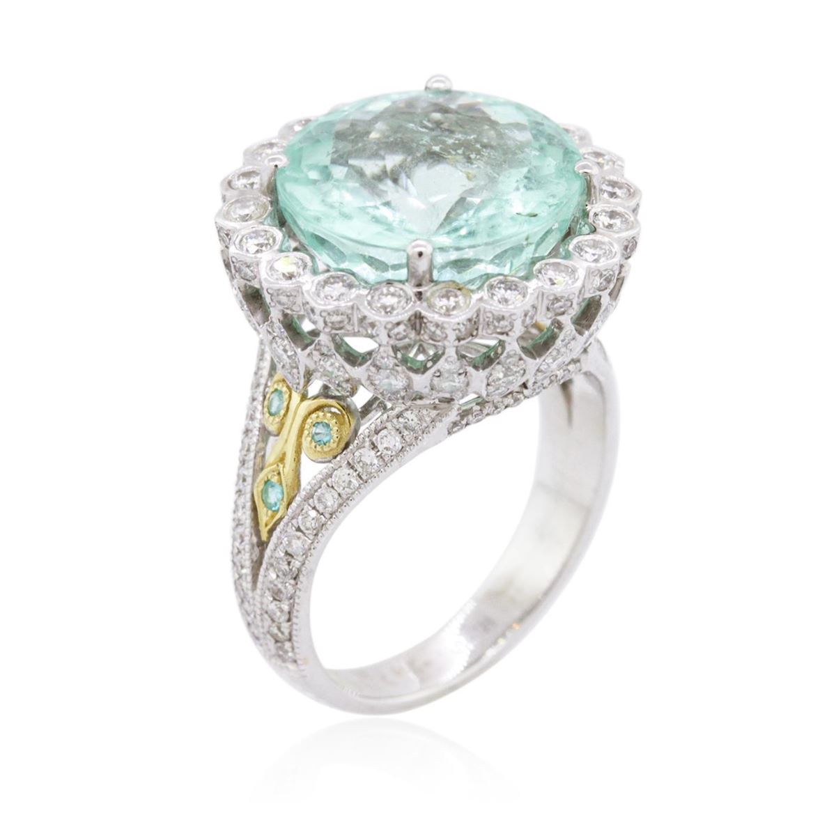 One electronically tested 18KT white and yellow gold ladies combination cast & assembled tourmaline and diamond ring with a bright polish finish. Identified with markings of "18K". Condition is new. Containing: One prong set round modified mixed cut natural paraiba tourmaline, measuring 12.98 - 13.02 x 8.45 mm, approximate weight of 8.71ct., clarity is moderately included, light, very slightly grayish, bluish green color, (GIA bG 3/3), cut is good. One Hundred Forty-Eight prong set round brilliant cut diamonds, measuring 1.50 - 1.00 x 0.75mm (depth est.) approximate total weight of 148 Stones = 1.05ct. Clarity: SI-2 to I-2. Color: I - J, Cut is Good. Six bead set round modified brilliant cut natural paraiba tourmalines, measuring 1.30 - 1.30 x 0.85 mm, approximate total weight of 0.06ct., clarity is heavily included, medium light, moderately strong, bluish green color, (GIA bG 4/4), cut is good. Colored gemstones are presumed to have been subjected to commonly used enhancement processes. All diamonds and colored gemstones are graded in the mounting, unless otherwise stated. Total Weight of Colored Stones 8.77ct. Total Weight of Diamonds 1.05ct. Total Weight of Ring 9.10 grams. GGL Appraised at $39,165.00.