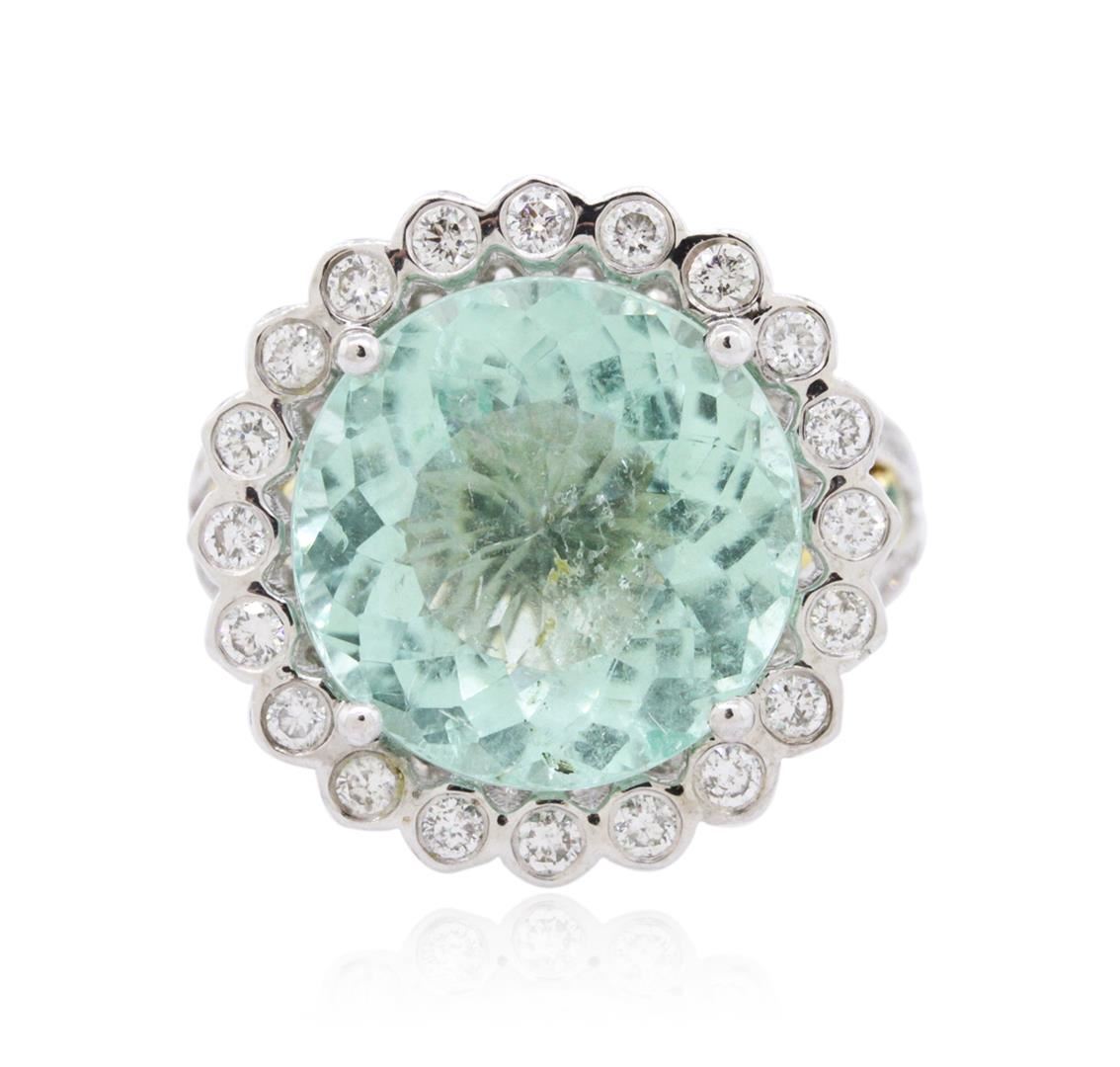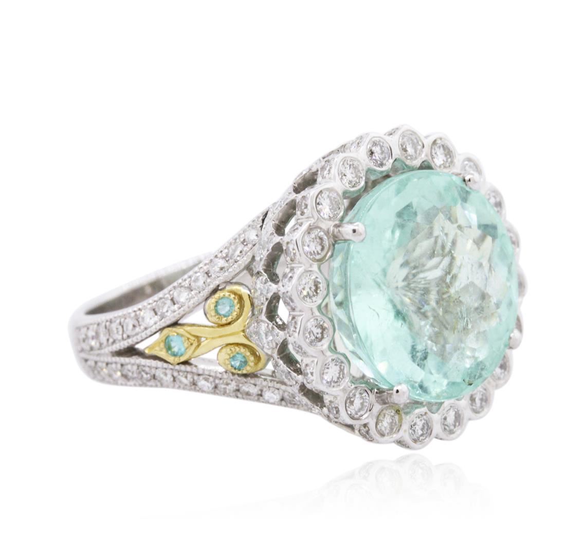 One electronically tested 18KT white and yellow gold ladies combination cast & assembled tourmaline and diamond ring with a bright polish finish. Identified with markings of "18K". Condition is new. Containing: One prong set round modified mixed cut natural paraiba tourmaline, measuring 12.98 - 13.02 x 8.45 mm, approximate weight of 8.71ct., clarity is moderately included, light, very slightly grayish, bluish green color, (GIA bG 3/3), cut is good. One Hundred Forty-Eight prong set round brilliant cut diamonds, measuring 1.50 - 1.00 x 0.75mm (depth est.) approximate total weight of 148 Stones = 1.05ct. Clarity: SI-2 to I-2. Color: I - J, Cut is Good. Six bead set round modified brilliant cut natural paraiba tourmalines, measuring 1.30 - 1.30 x 0.85 mm, approximate total weight of 0.06ct., clarity is heavily included, medium light, moderately strong, bluish green color, (GIA bG 4/4), cut is good. Colored gemstones are presumed to have been subjected to commonly used enhancement processes. All diamonds and colored gemstones are graded in the mounting, unless otherwise stated. Total Weight of Colored Stones 8.77ct. Total Weight of Diamonds 1.05ct. Total Weight of Ring 9.10 grams. GGL Appraised at $39,165.00.