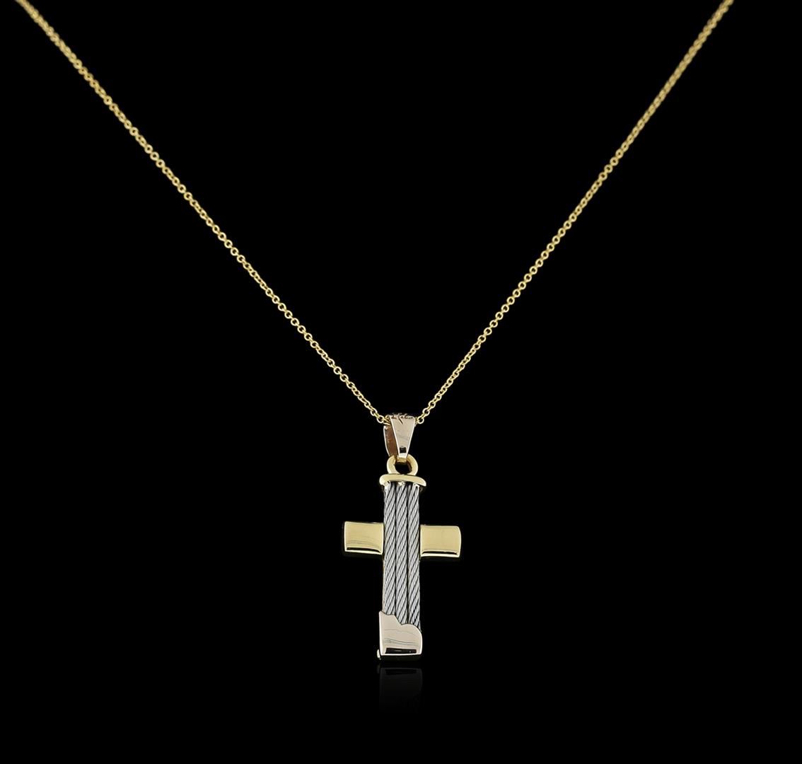 One cross pendant with chain featuring: 18KT yellow and white gold weighing 6.11 grams.