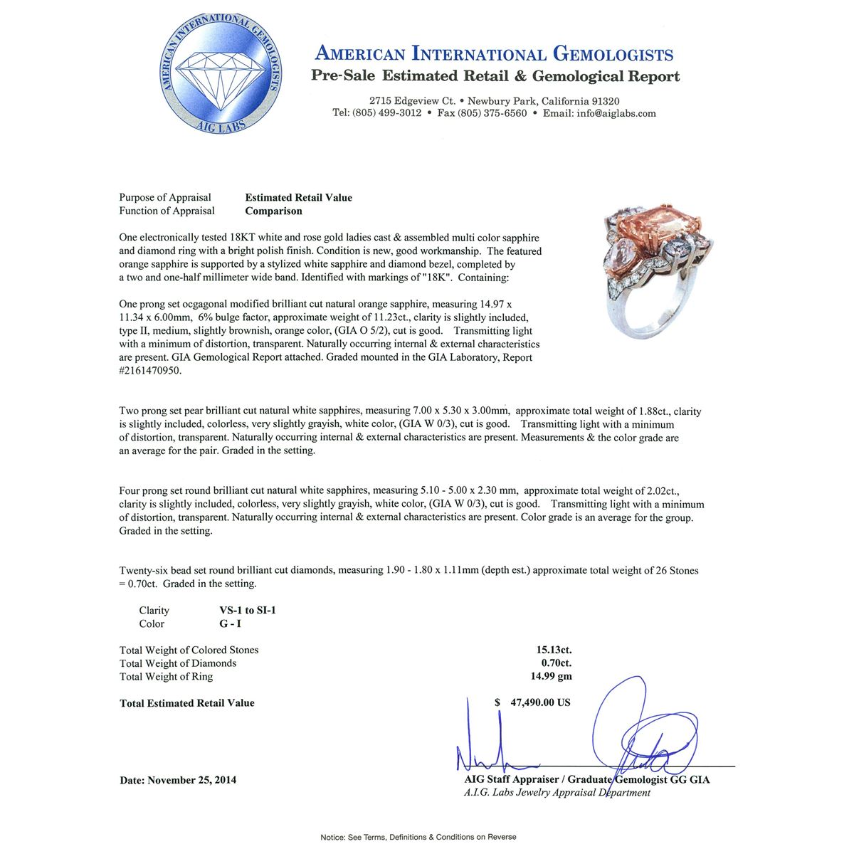 One electronically tested 18KT white and rose gold ladies cast & assembled multi color sapphire and diamond ring with a bright polish finish. The featured orange sapphire is supported by a stylized white sapphire and diamond bezel, completed by a two and one-half millimeter wide band. Identified with markings of "18K". Condition is new, good workmanship. Containing: One prong set octagonal modified brilliant cut natural orange sapphire, measuring 14.97 x 11.34 x 6.00mm, 6%. bulge factor, approximate weight of 11.23ct., clarity is slightly included, type II, medium, slightly brownish, orange color, (GIA O 5/2), cut is good. Transmitting light with a minimum of distortion, transparent. Naturally occurring internal & external characteristics are present. GIA Gemological Report attached. Graded mounted in the GIA Laboratory, Report #2161470950.Two prong set pear brilliant cut natural white sapphires, measuring 7.00 x 5.30 x 3.00mm, approximate total weight of 1.88ct., clarity is slightly included, colorless, very slightly grayish, white color, (GIA W 0/3), cut is good. Transmitting light with a minimum of distortion, transparent. Naturally occurring internal & external characteristics are present. Measurements & the color grade are an average for the pair. Graded in the setting. Four prong set round brilliant cut natural white sapphires, measuring 5.10 - 5.00 x 2.30 mm, approximate total weight of 2.02ct., clarity is slightly included, colorless, very slightly grayish, white color, (GIA W 0/3), cut is good. Transmitting light with a minimum of distortion, transparent. Naturally occurring internal & external characteristics are present. Color grade is an average for the group. Graded in the setting. Twenty-Six bead set round brilliant cut diamonds, measuring 1.90 - 1.80 x 1.11mm (depth est.) approximate total weight of 26 Stones = 0.70ct. Graded in the setting. Clarity: VS-1 to SI-1. Color: G - I. Total Weight of Colored Stones 15.13ct. Total Weight of Diamonds 0.70ct. Total Weight of Ring 14.99 grams. AIG Appraised at $47,490.00.