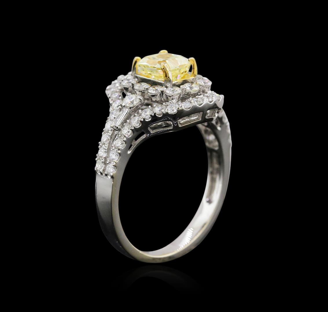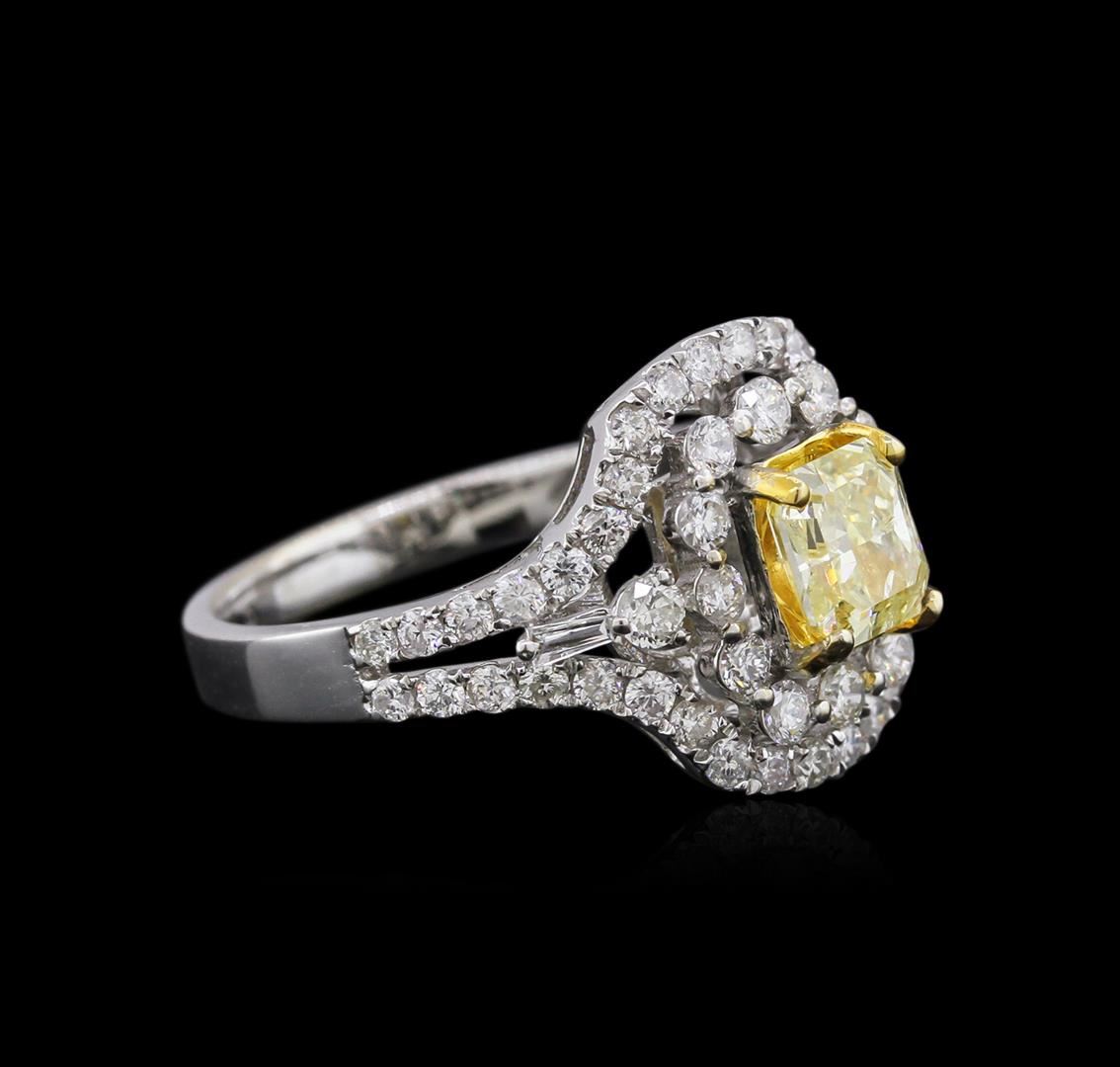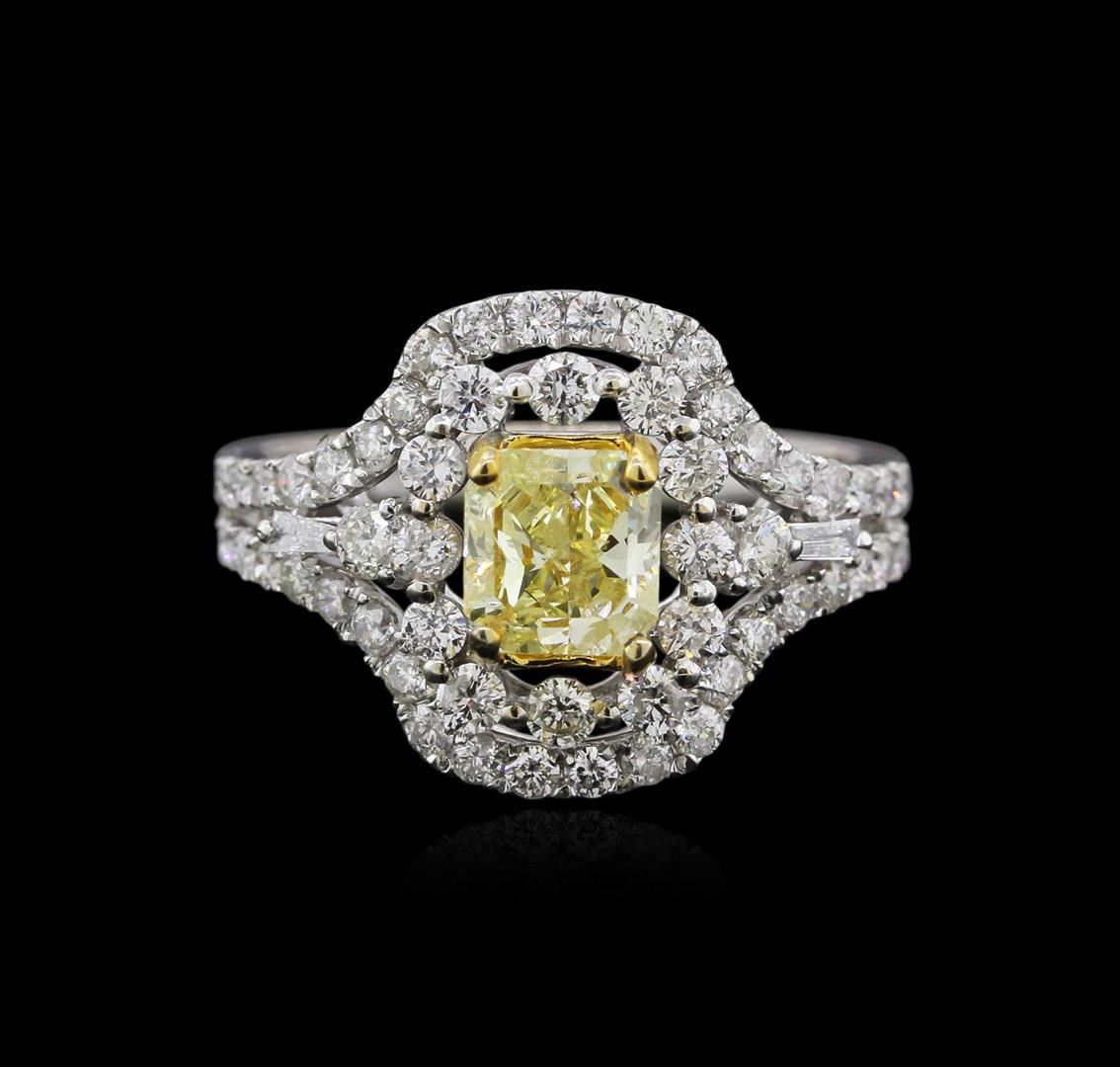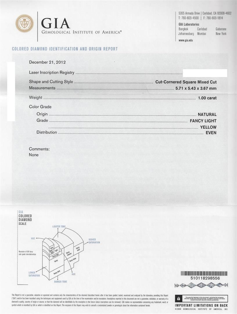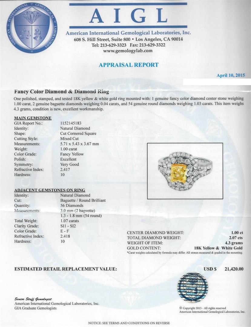 One polished, stamped, and tested 18K yellow & white gold ring mounted with: 1 genuine fancy color diamond center stone weighing 1.00 carat, and 2 genuine baguette diamonds weighing 0.04 carats, and 54 genuine round diamonds weighing 1.03 carats. This item weighs 4.3 grams, condition is new, excellent workmanship. MAIN GEMSTONE: GIA Report No.: 1152145183. Identity: Natural Diamond. Shape: Cut Cornered Square. Cutting Style: Mixed Cut. Measurements: 5.71 x 5.43 x 3.67 mm. Weight: 1.00 carat. Color Grade: Fancy Yellow. Polish: Excellent. Symmetry: Very Good. Refractive Index: 2.417. Hardness: 10. ADJACENT GEMSTONES ON RING: Identity: Natural Diamond. Cut: Baguette / Round Brilliant. Quantity: 56 Diamonds. Measurements: 3.0 mm (2 baguette) 1.3 - 1.8 mm (54 round). Total Weight: 1.07 carats. Clarity Grade: SI1 - SI2. Color Grade: E - F. Refractive Index: 2.418. Hardness: 10. Center Diamond Weight: 1.00 ct. Total Diamond Weight: 2.07 cts. Weight of Item: 4.3 grams. Gold Content: 18K Yellow & White Gold. AIGL Appraised at $21,420.00.