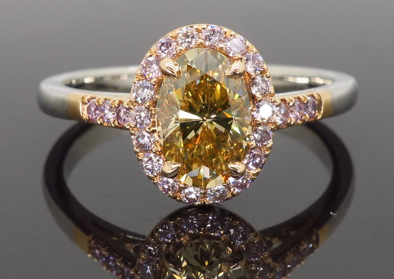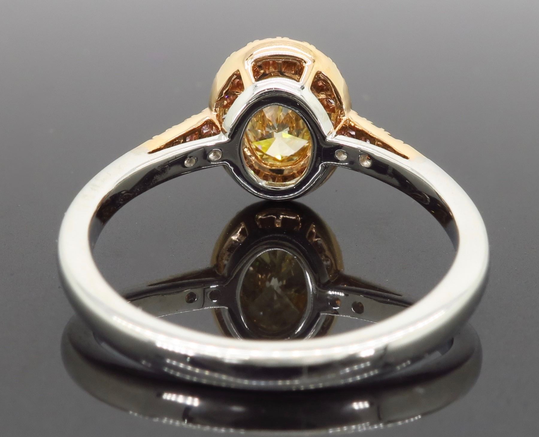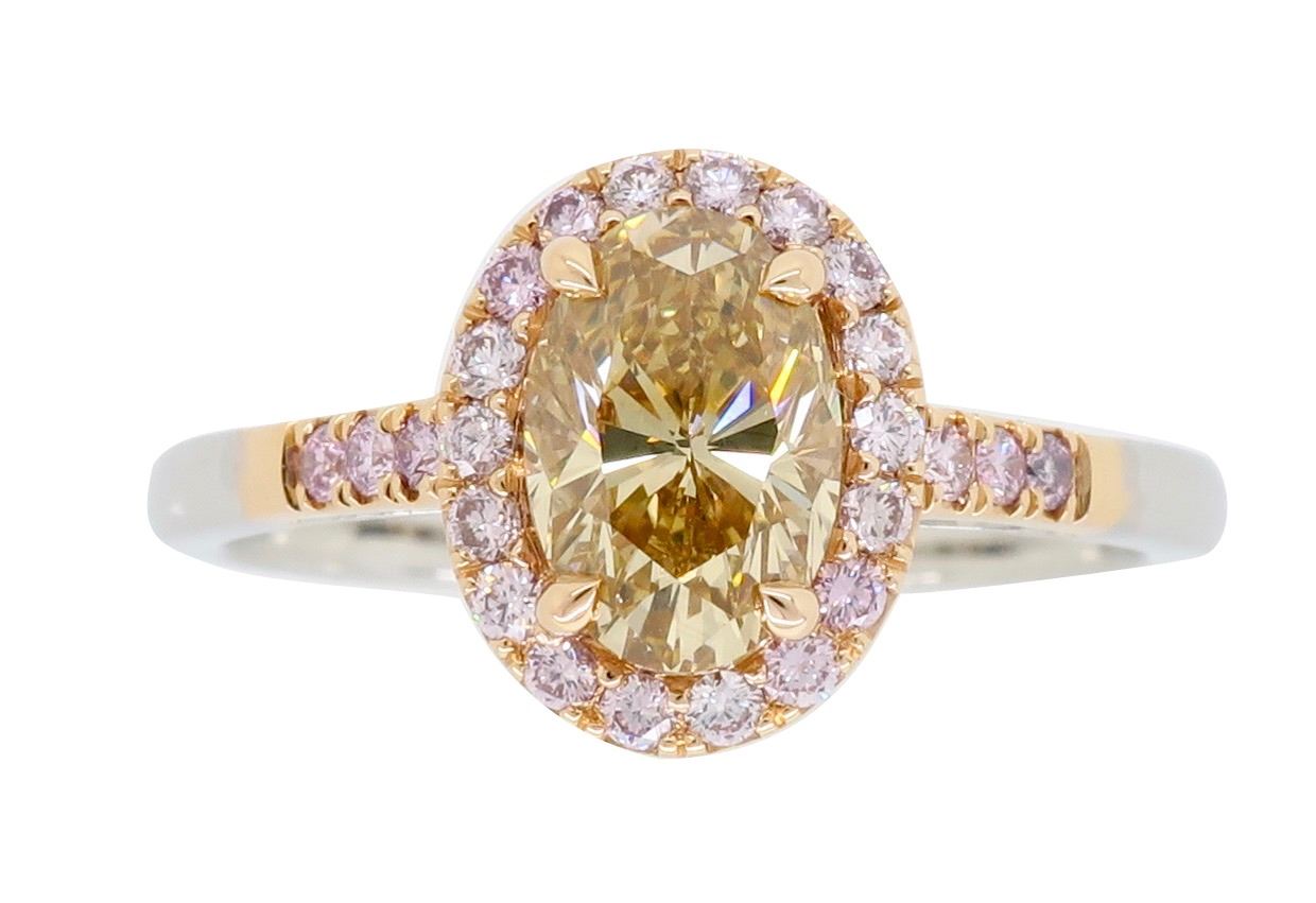 One 18KT Two Tone Rose & White Gold 1.25ctw Diamond Ring. (1) Oval shaped center Diamond with a color of Caramel and a clarity of VS-2. Side Diamonds with a total weight of 0.25cts with a color of soft pink. Total weight of this ring is 4.5 grams. Ring size is 7.25.