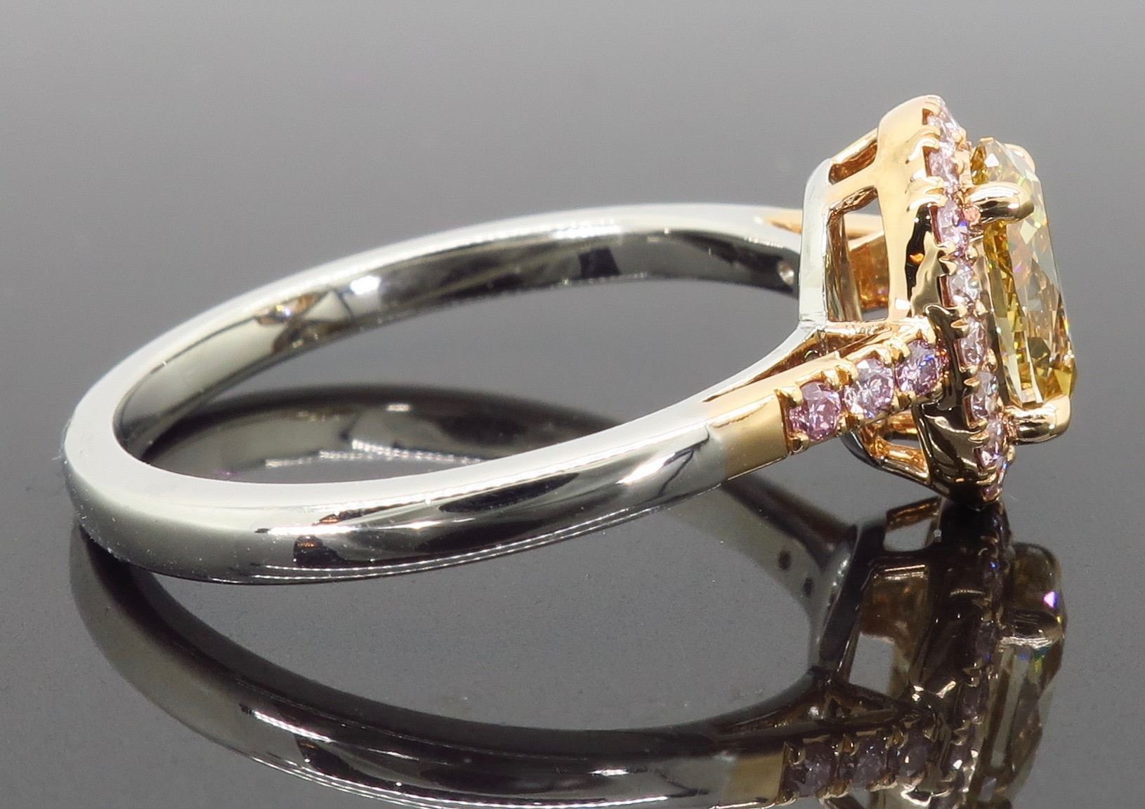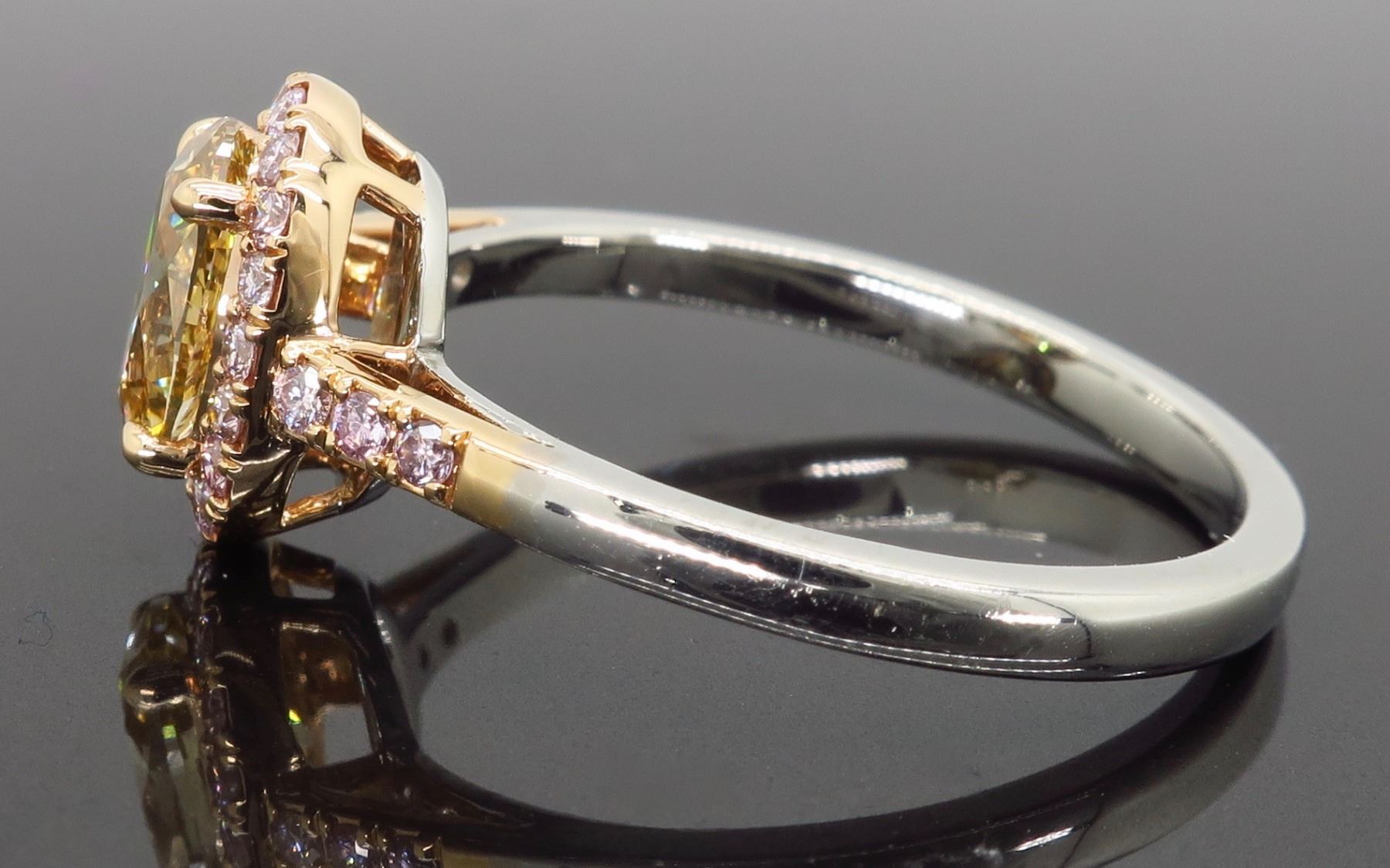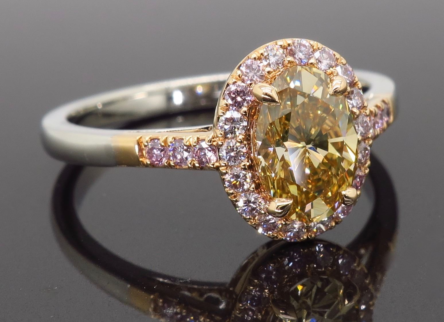 One 18KT Two Tone Rose & White Gold 1.25ctw Diamond Ring. (1) Oval shaped center Diamond with a color of Caramel and a clarity of VS-2. Side Diamonds with a total weight of 0.25cts with a color of soft pink. Total weight of this ring is 4.5 grams. Ring size is 7.25.
