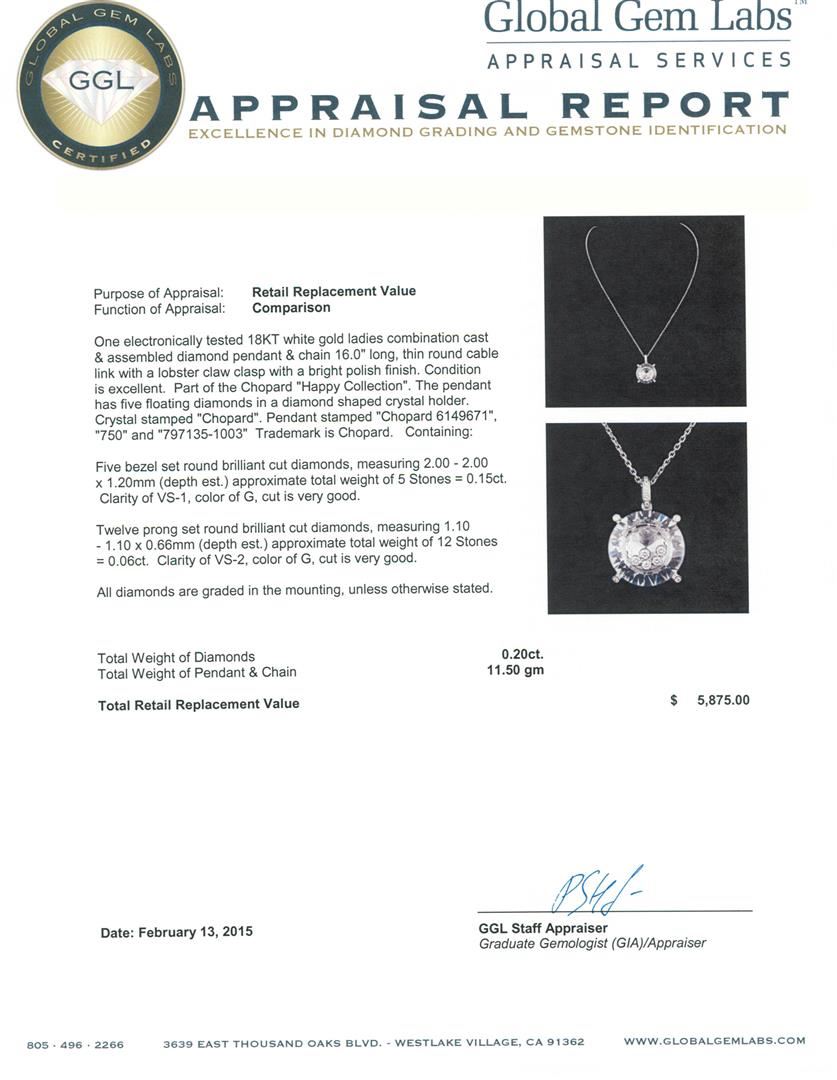 One electronically tested 18KT white gold ladies combination cast & assembled diamond pendant & chain 16.0" long, thin round cable link with a lobster claw clasp with a bright polish finish. Part of the Chopard "Happy Collection". The pendant has five floating diamonds in a diamond shaped crystal holder. Crystal stamped "Chopard". Pendant stamped "Chopard 6149671", "750" and "797135-1003" Trademark is Chopard. Condition is excellent. Containing: Five bezel set round brilliant cut diamonds, measuring 2.00 - 2.00 x 1.20mm (depth est.) approximate total weight of 5 Stones = 0.15ct. Clarity: VS-1. Color: G, Cut is Very Good. Twelve prong set round brilliant cut diamonds, measuring 1.10 - 1.10 x 0.66mm (depth est.) approximate total weight of 12 Stones = 0.06ct. Clarity: VS-2. Color: G, Cut is Very Good. All diamonds are graded in the mounting, unless otherwise stated. Total Weight of Diamonds 0.20ct. Total Weight of Pendant & Chain 11.50 grams. GGL Appraised at $5,875.00.