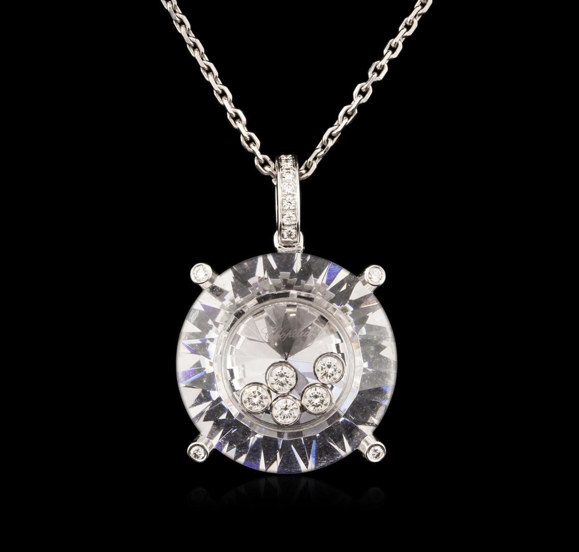 One electronically tested 18KT white gold ladies combination cast & assembled diamond pendant & chain 16.0" long, thin round cable link with a lobster claw clasp with a bright polish finish. Part of the Chopard "Happy Collection". The pendant has five floating diamonds in a diamond shaped crystal holder. Crystal stamped "Chopard". Pendant stamped "Chopard 6149671", "750" and "797135-1003" Trademark is Chopard. Condition is excellent. Containing: Five bezel set round brilliant cut diamonds, measuring 2.00 - 2.00 x 1.20mm (depth est.) approximate total weight of 5 Stones = 0.15ct. Clarity: VS-1. Color: G, Cut is Very Good. Twelve prong set round brilliant cut diamonds, measuring 1.10 - 1.10 x 0.66mm (depth est.) approximate total weight of 12 Stones = 0.06ct. Clarity: VS-2. Color: G, Cut is Very Good. All diamonds are graded in the mounting, unless otherwise stated. Total Weight of Diamonds 0.20ct. Total Weight of Pendant & Chain 11.50 grams. GGL Appraised at $5,875.00.