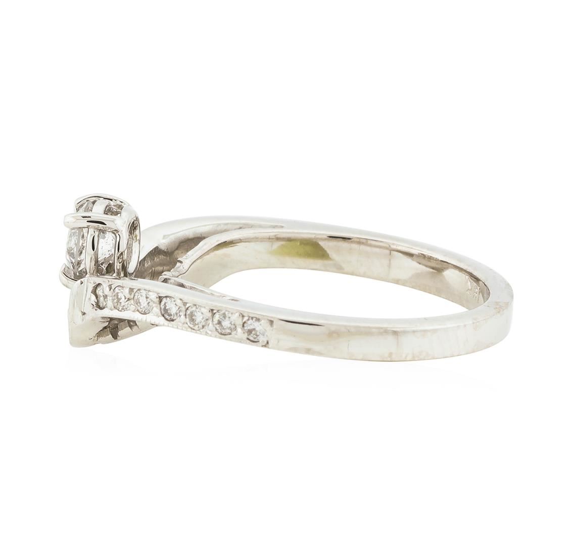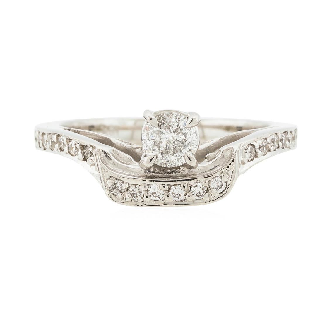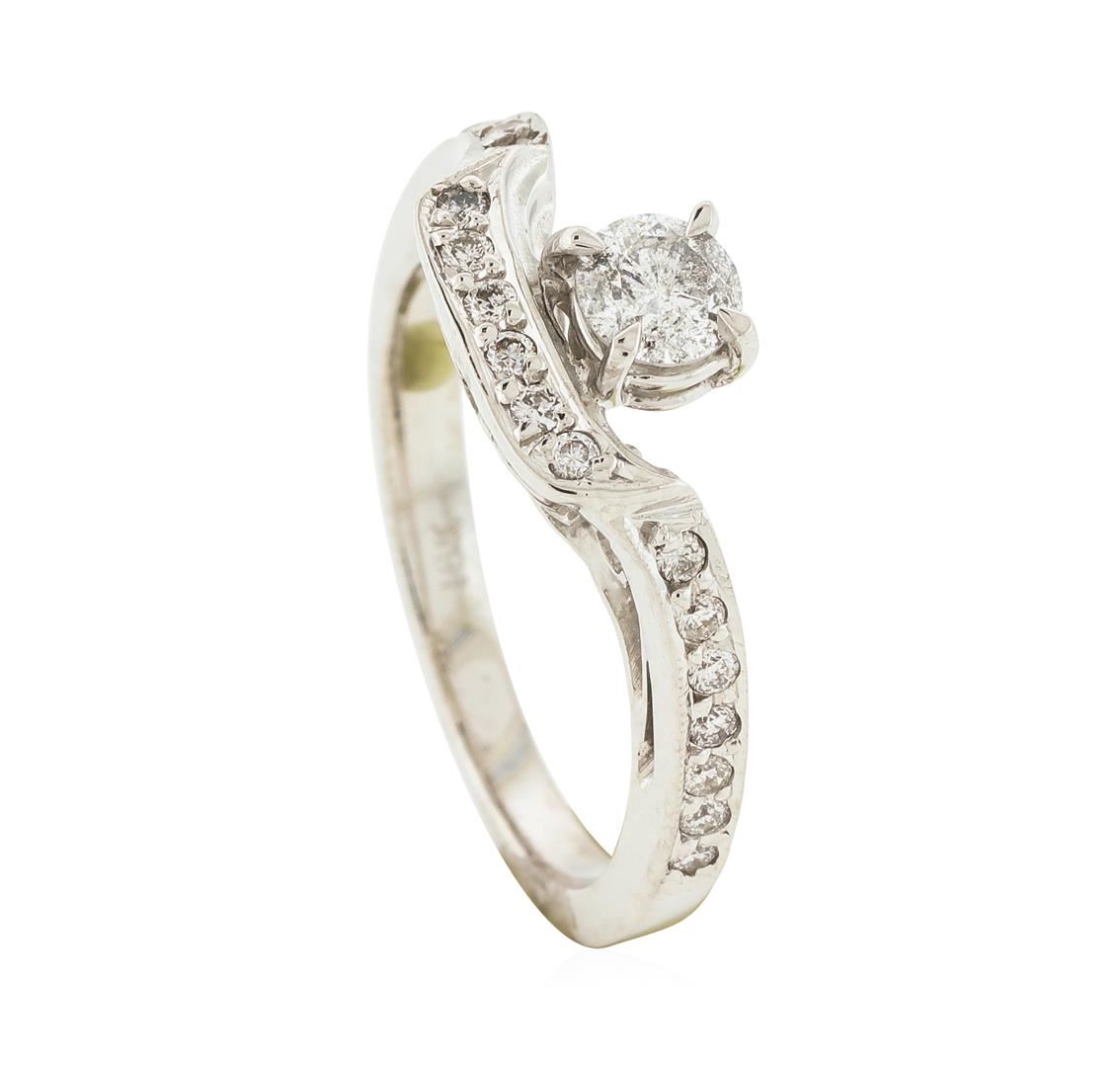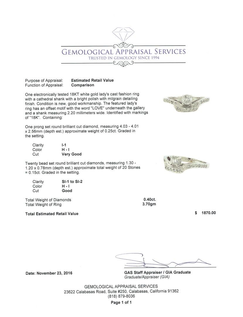 One electronically tested 18KT white gold lady's cast fashion ring with a cathedral shank with a bright polish with milgrain detailing finish. The featured lady's ring has an offset motif with the word "LOVE" underneath the gallery and a shank measuring 2.20 millimeters wide. Identified with markings of "18K". Condition is new, good workmanship. Containing: One prong set round brilliant cut diamond, measuring 4.03 - 4.01 x 2.56mm (depth est.) approximate weight of 0.25ct. Graded in the setting. Clarity: I-1. Color: H - ICut Very Good Twenty bead set round brilliant cut diamonds, measuring 1.30 - 1.20 x 0.78mm (depth est.) approximate total weight of 20 Stones = 0.15ct. Graded in the setting. Clarity: SI-1 to SI-2. Color: H - ICut Good. Total Weight of Diamonds 0.40ct. Total Weight of Ring 3.70gm. GAS Appraised at $1,870.00.