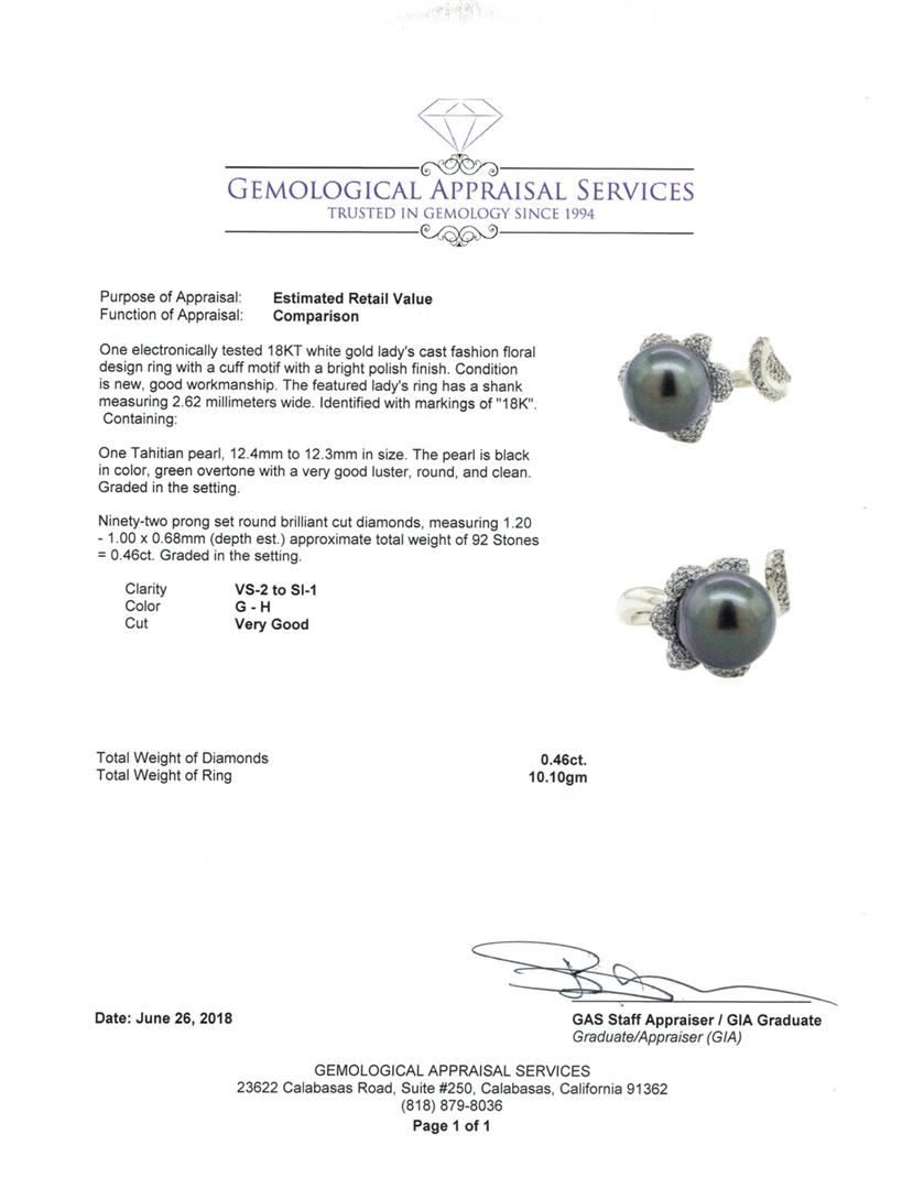 One electronically tested 18KT white gold lady's cast fashion floral design ring with a cuff motif with a bright polish finish. The featured lady's ring has a shank measuring 2.62 millimeters wide. Identified with markings of '18K'. Condition is new, good workmanship. Containing: One Tahitian pearl, 12.4mm to 12.3mm in size. The pearl is black in color, green overtone with a very good luster, round, and clean. Graded in the setting. Ninety-Two prong set round brilliant cut diamonds, measuring 1.20 - 1.00 x 0.68mm (depth est.) approximate total weight of 92 Stones = 0.46ct. Graded in the setting. Color G - H Clarity VS-2 to SI-1 Cut Very Good. Total Weight of Diamonds 0.46ct. Total Weight of Ring 10.10gm. GAS Appraised.