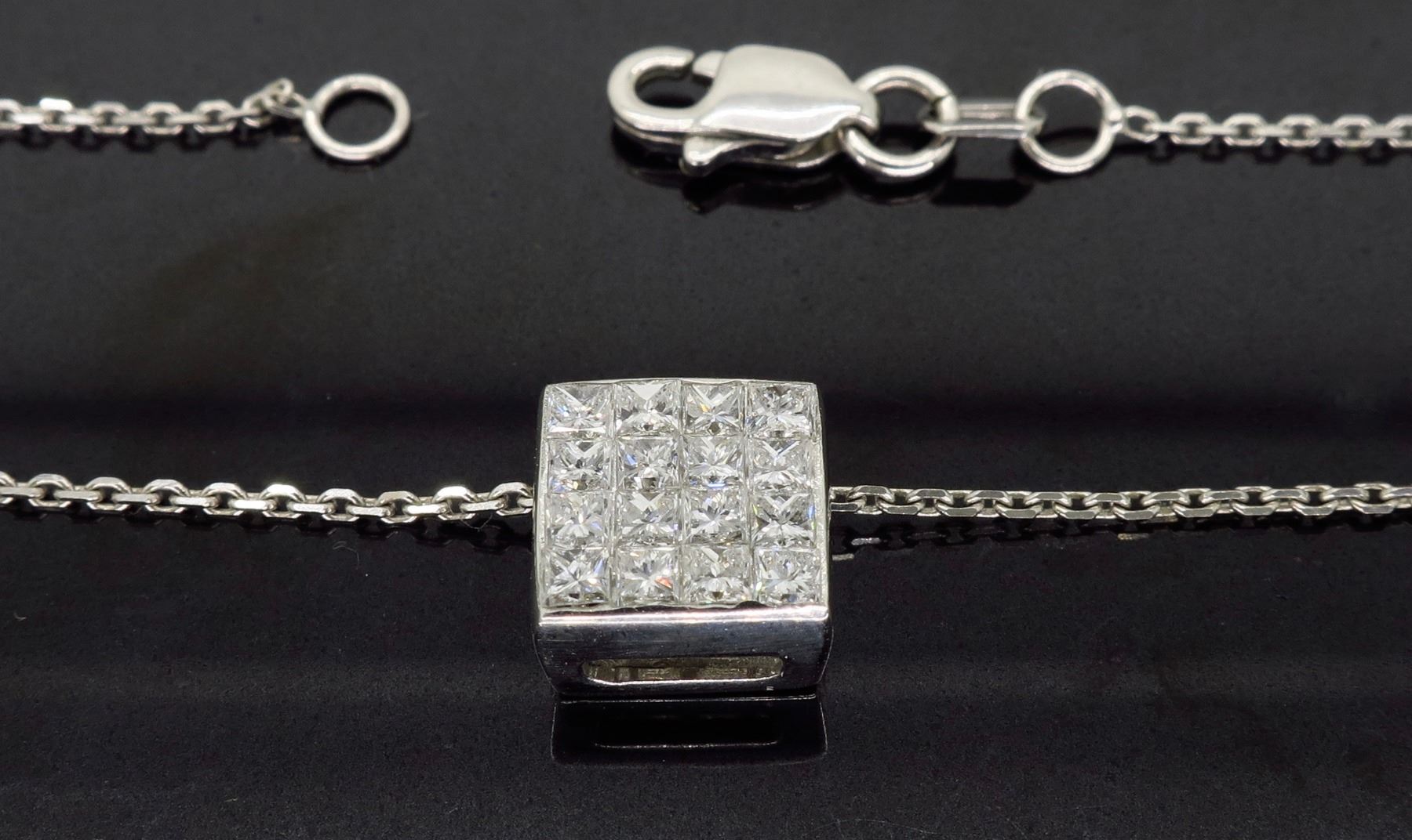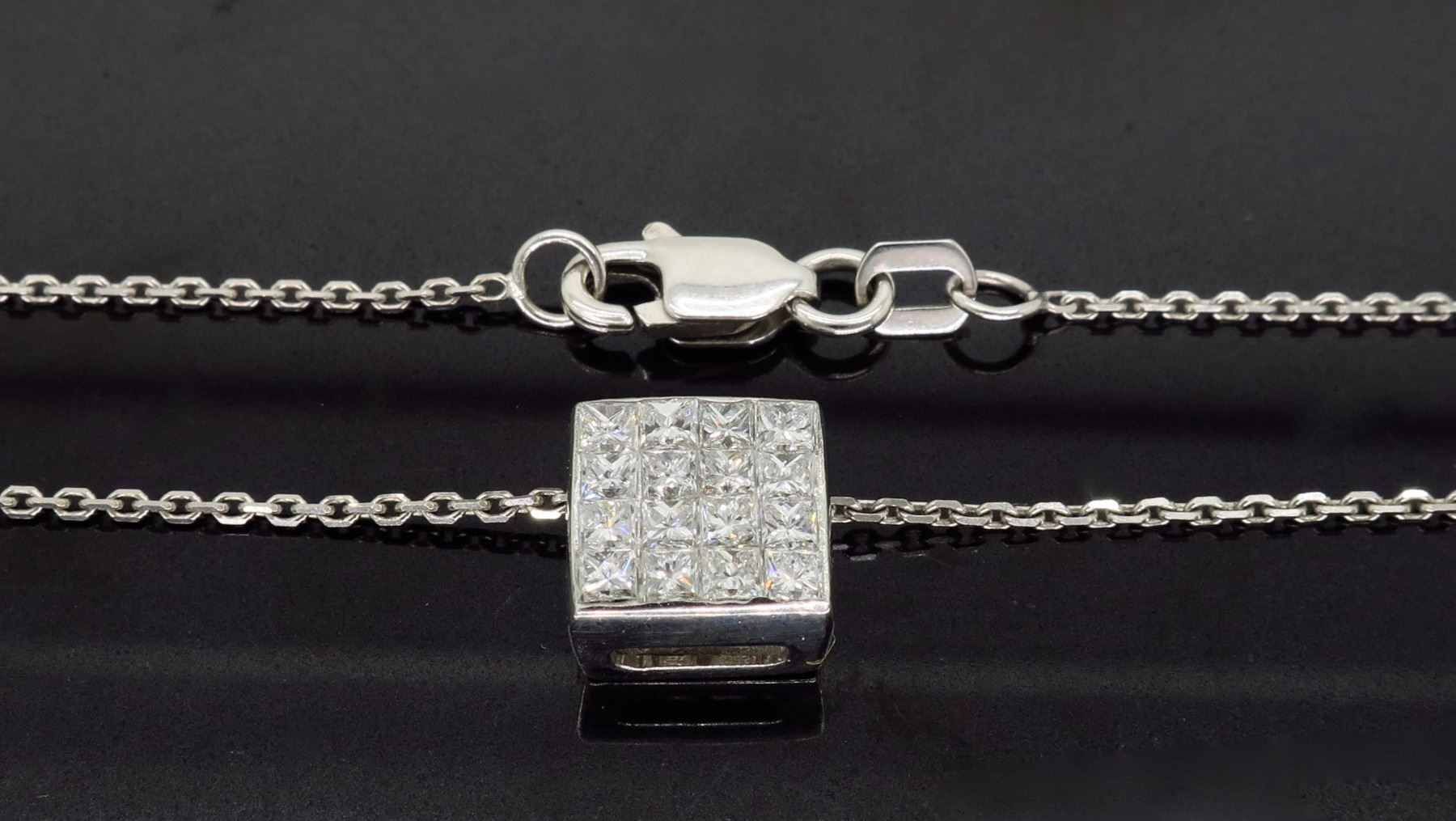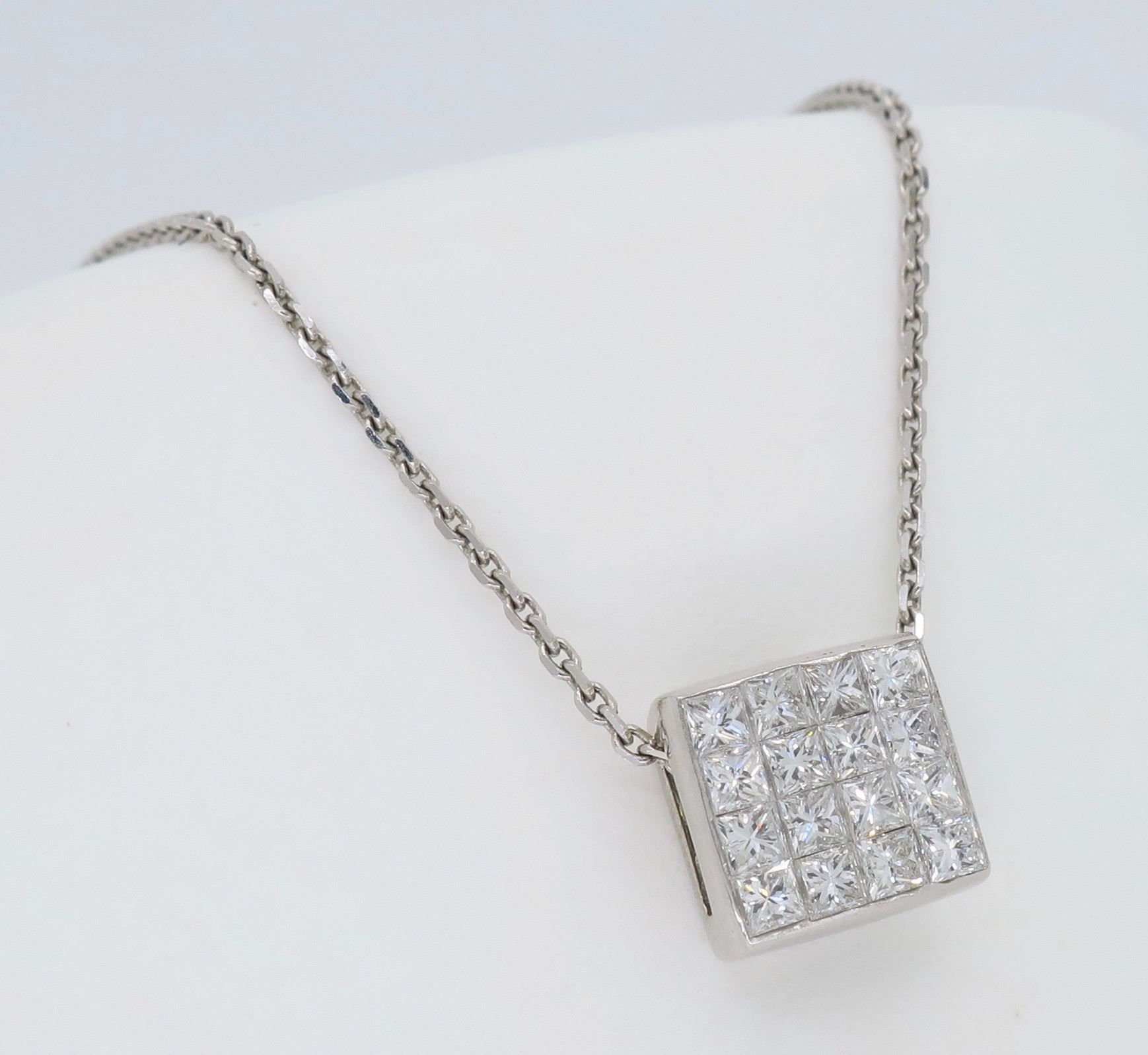One 18KT White Gold 0.50ctw Diamond Pendant with Chain. (16) Princess cut Diamonds with a total weight of 0.50cts with a color of G-I and clarity of VS-2. Total weight of this pendant is 3.2 grams. Total length of this chain is 16.5 inches.