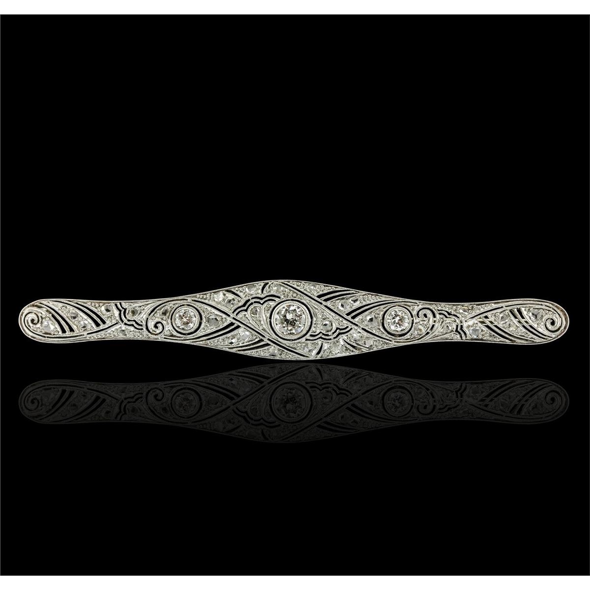 One electronically tested 18KT white gold ladies cast & assembled diamond brooch. The brooch is completed by a horizontally placed pin. Bright polish finish with milgrain detailing throughout. Area measurements 2.75 x 0.50 inches. The brooch is reminiscent of the jewelry designs from the Art Deco Period. The Paris Exposition of Decorative Arts and Modern Manufacturers in 1925 gave the movement its name. The Art Deco Period is characterized with jewelry designs composed of bold geometric designs, & cubism. Condition is good. Containing: One bezel set Old European cut diamond, measuring 4.20 - 4.10 x 1.30mm (depth est.) approximate weight of 0.15ct. Cutting style circa early 20th century. Graded in the setting. Clarity: SI-2. Color: I Two bezel set Old European cut diamonds, measuring 2.80 - 2.70 x 1.50mm (depth est.) approximate total weight of 2 Stones = 0.16ct. Cutting style circa early 20th century. Graded in the setting. Clarity: VS-2. Color: G Thirty-Two bead set rose cut diamonds, measuring 1.40 - 1.30 x 0.70mm (depth est.) approximate total weight of 32 Stones = 0.20ct. Graded in the setting. Clarity: SI-1 to I-1. Color: G - I. Total Weight of Diamonds 0.51ct. Total Weight of Brooch 6.24 grams. AIG Appraised at $2,840.00.