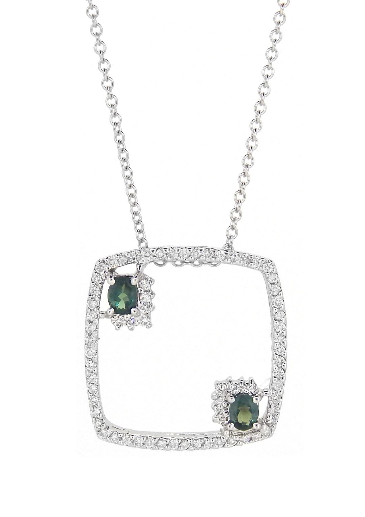 One 18KT White Gold 0.58ctw Alexandrite and Diamond Pendant with Chain. (2) Alexandrite stones with a total weight of 0.58cts. (69) Diamonds with a total weight of 0.57cts. Total weight of this pendant is 8 grams. Total weight of this chain is 18 inches.