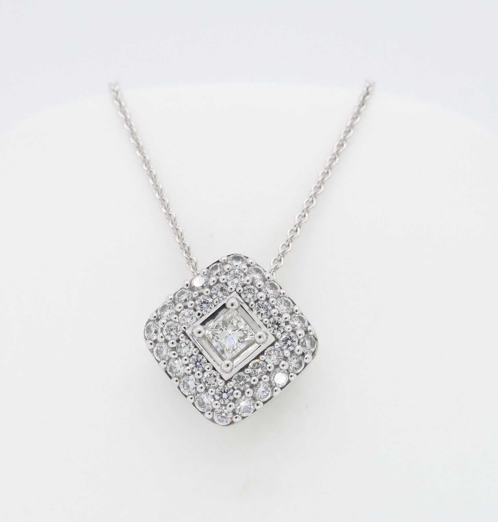 One 18KT White Gold 0.60ctw Diamond Pendant with Chain. (1) princess cut round Diamond with a total weight of 0.15cts with a color of G-I and clarity of VS-2 to SI-1. (36) round Diamonds with a total weight of 0.45cts. Total weight of this pendant is 5.8 grams. Total length of this chain is 18 inches. Total length of this pendant is 0.50 inches.