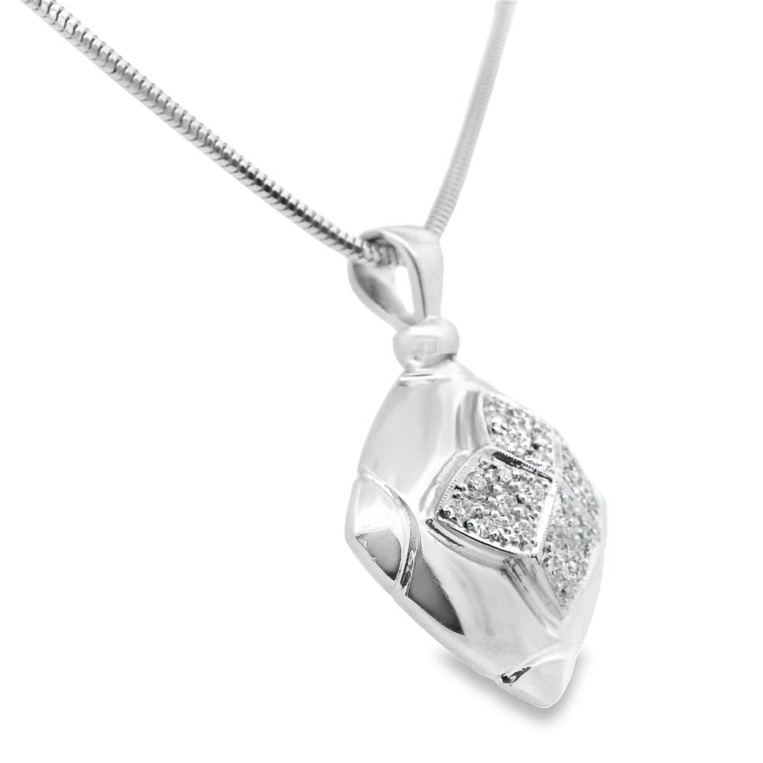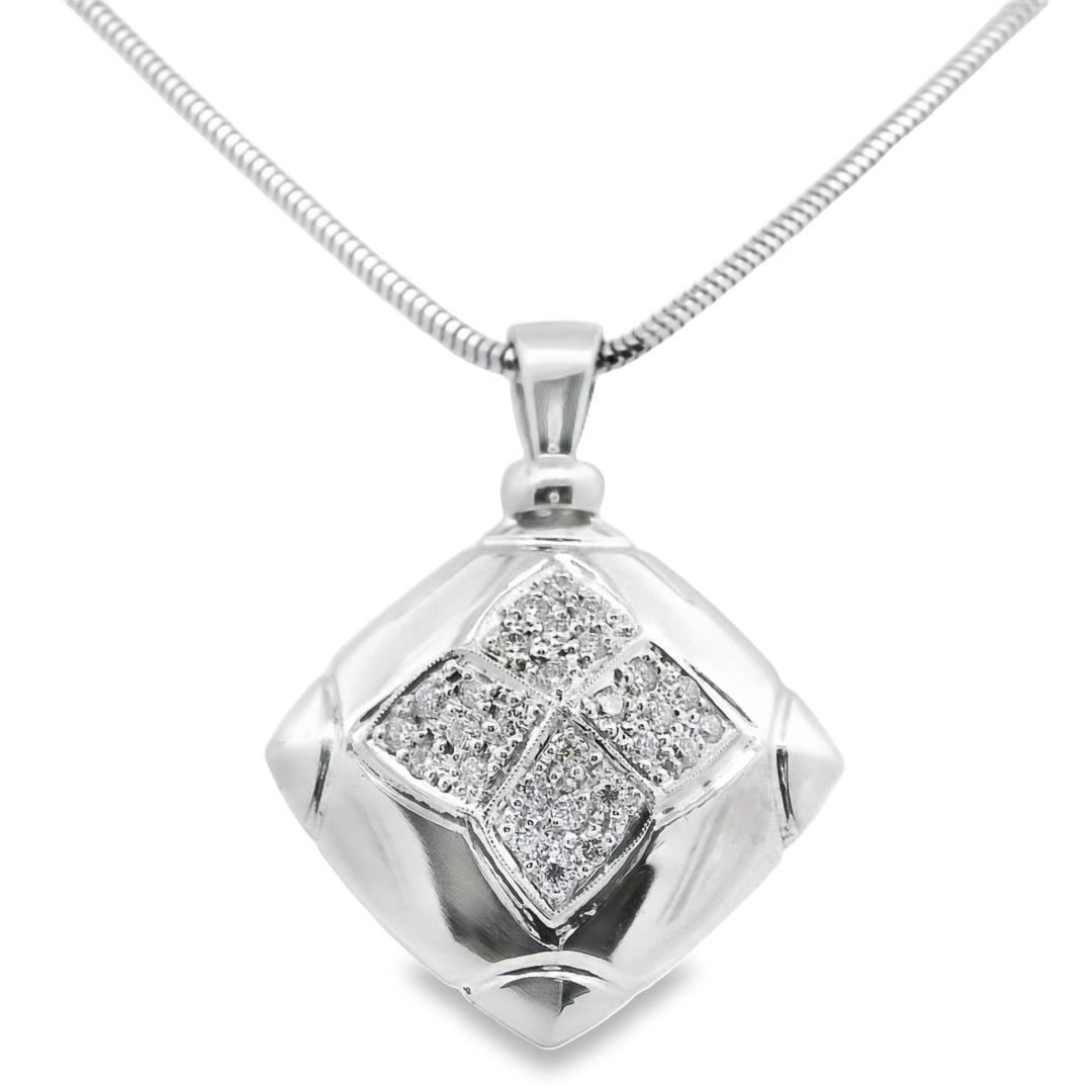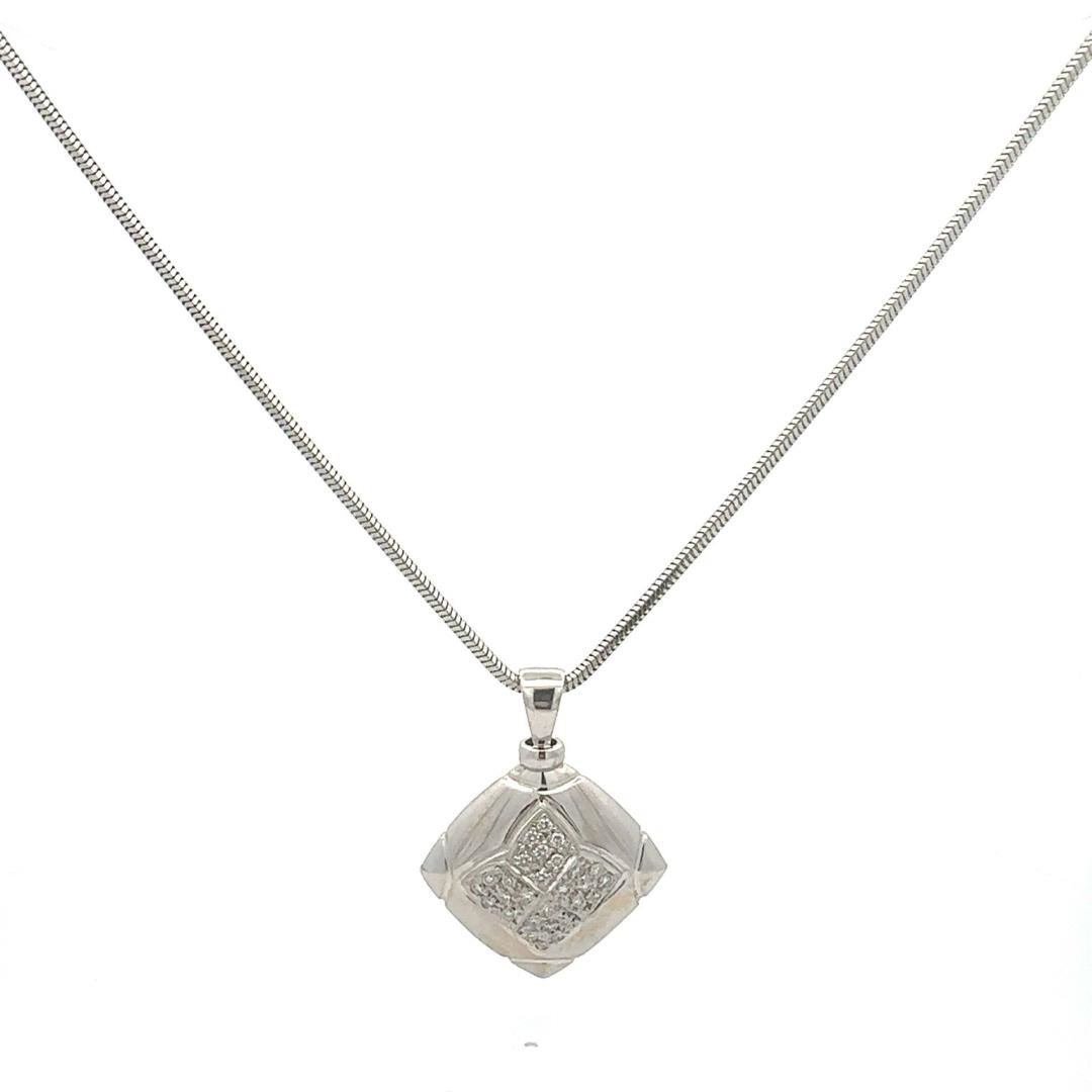 One electronically tested 18KT white gold lady's combination cast & assembled fashion square pendant & chain 15.0" long, 1.9 millimeter round snake chain with a lobster claw clasp with a square halo dome motif with a bright polish with milgrain detailing GAS Appraised.