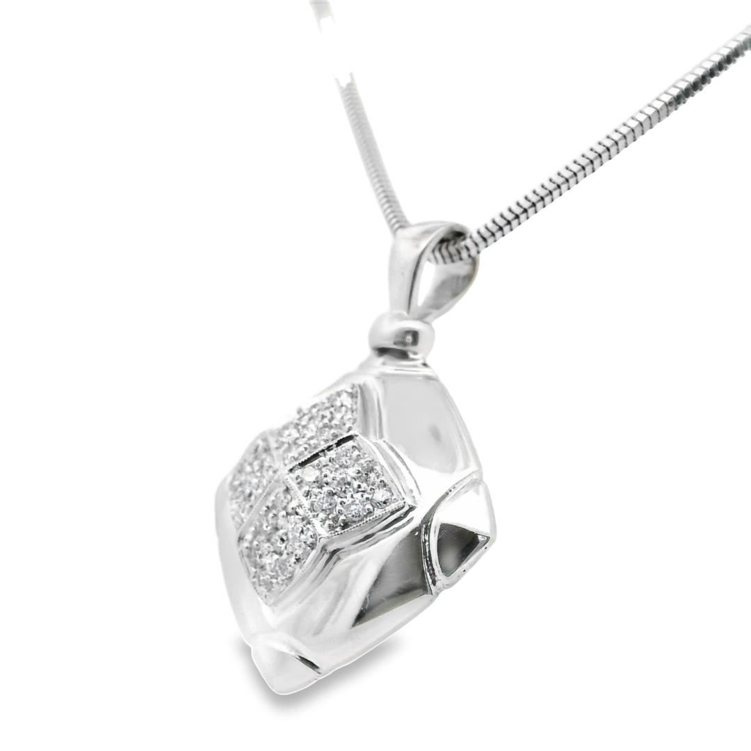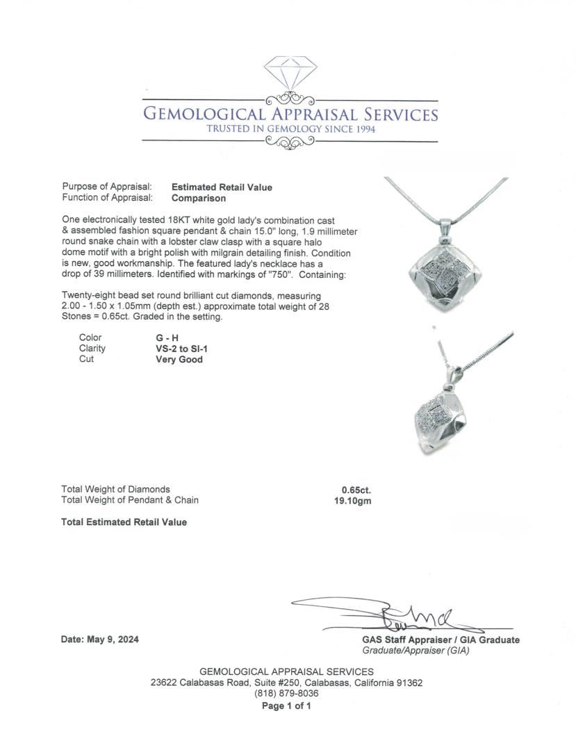 One electronically tested 18KT white gold lady's combination cast & assembled fashion square pendant & chain 15.0" long, 1.9 millimeter round snake chain with a lobster claw clasp with a square halo dome motif with a bright polish with milgrain detailing GAS Appraised.