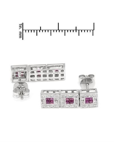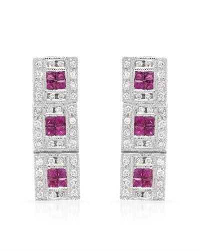 One 18KT White Gold 0.65ctw Ruby and Diamond Earrings. (24) Rubies with a total weight of 0.65cts. (72) Round Diamonds with a total weight of 0.32cts with a color of I and clarity of I-1. Total weight of these earrings are 5.38 grams.
