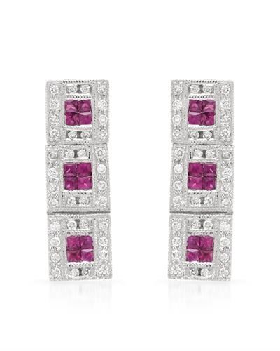 One 18KT White Gold 0.65ctw Ruby and Diamond Earrings. (24) Rubies with a total weight of 0.65cts. (72) Round Diamonds with a total weight of 0.32cts with a color of I and clarity of I-1. Total weight of these earrings are 5.38 grams.
