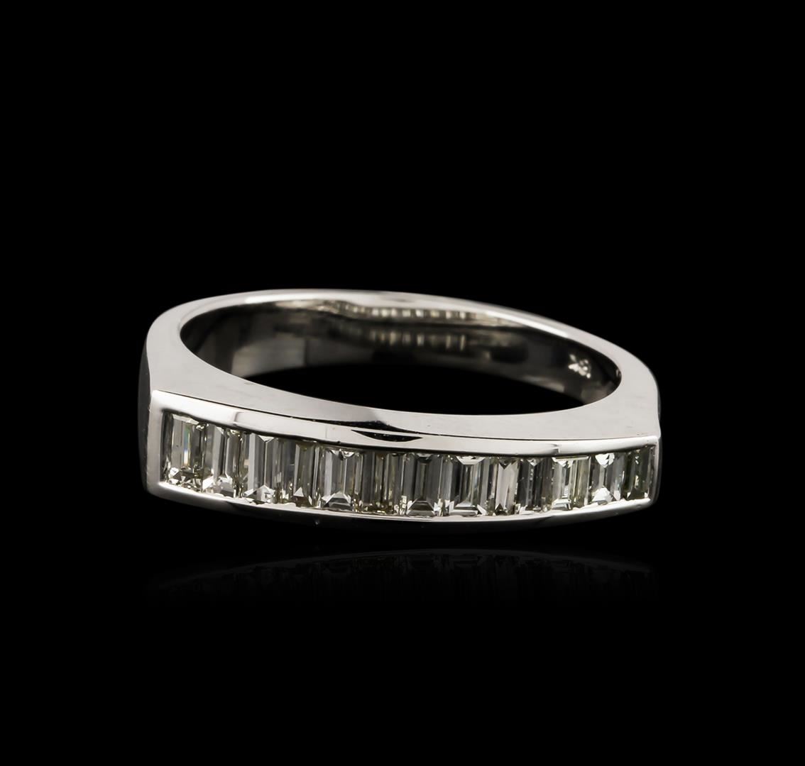 One electronically tested 18KT white gold ladies cast diamond ring with a bright polish finish. Identified with markings of "18K". Condition is new. Containing: Thirteen channel set baguette cut diamonds, measuring from 2.00 x 1.50 x 1.28mm (depth est.) to 3.00 x 1.80 x 1.53mm (depth est.) approximate total weight of 13 Stones = 0.69ct. Clarity: VS-2 to SI-1. Color: H - I, Cut is Good. All diamonds are graded in the mounting, unless otherwise stated. Total Weight of Diamonds 0.69ct. Total Weight of Ring 4.80 grams. GGL Appraised at $3,490.00.