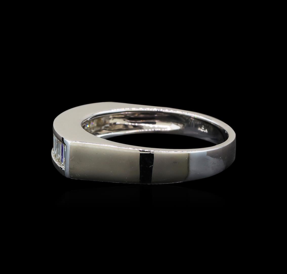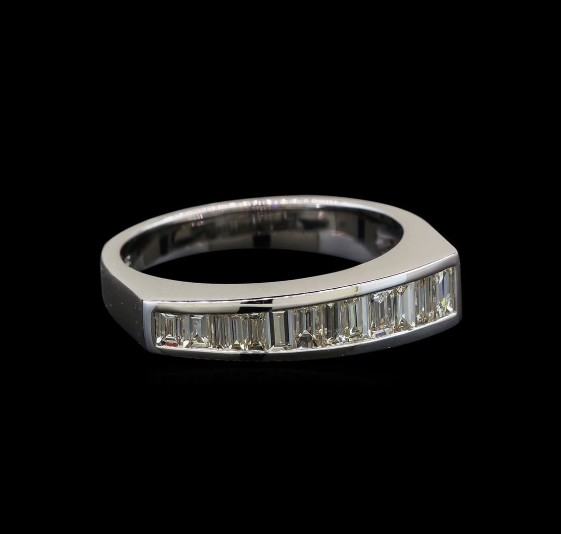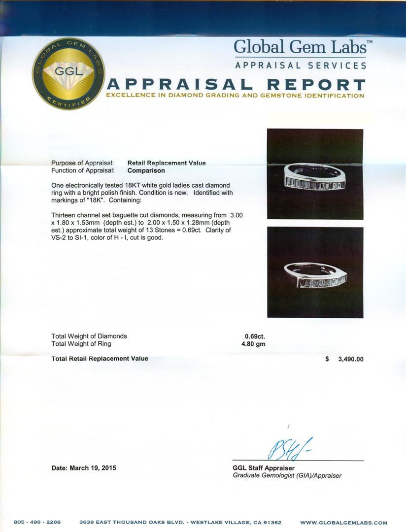 One electronically tested 18KT white gold ladies cast diamond ring with a bright polish finish. Identified with markings of "18K". Condition is new. Containing: Thirteen channel set baguette cut diamonds, measuring from 2.00 x 1.50 x 1.28mm (depth est.) to 3.00 x 1.80 x 1.53mm (depth est.) approximate total weight of 13 Stones = 0.69ct. Clarity: VS-2 to SI-1. Color: H - I, Cut is Good. All diamonds are graded in the mounting, unless otherwise stated. Total Weight of Diamonds 0.69ct. Total Weight of Ring 4.80 grams. GGL Appraised at $3,490.00.