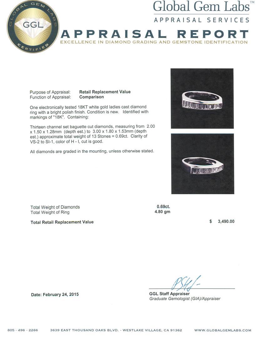 One electronically tested 18KT white gold ladies cast diamond ring with a bright polish finish. Identified with markings of "18K". Condition is new. Containing: Thirteen channel set baguette cut diamonds, measuring from 2.00 x 1.50 x 1.28mm (depth est.) to 3.00 x 1.80 x 1.53mm (depth est.) approximate total weight of 13 Stones = 0.69ct. Clarity: VS-2 to SI-1. Color: H - I, Cut is Good. All diamonds are graded in the mounting, unless otherwise stated. Total Weight of Diamonds 0.69ct. Total Weight of Ring 4.80 grams. GGL Appraised at $3,490.00.