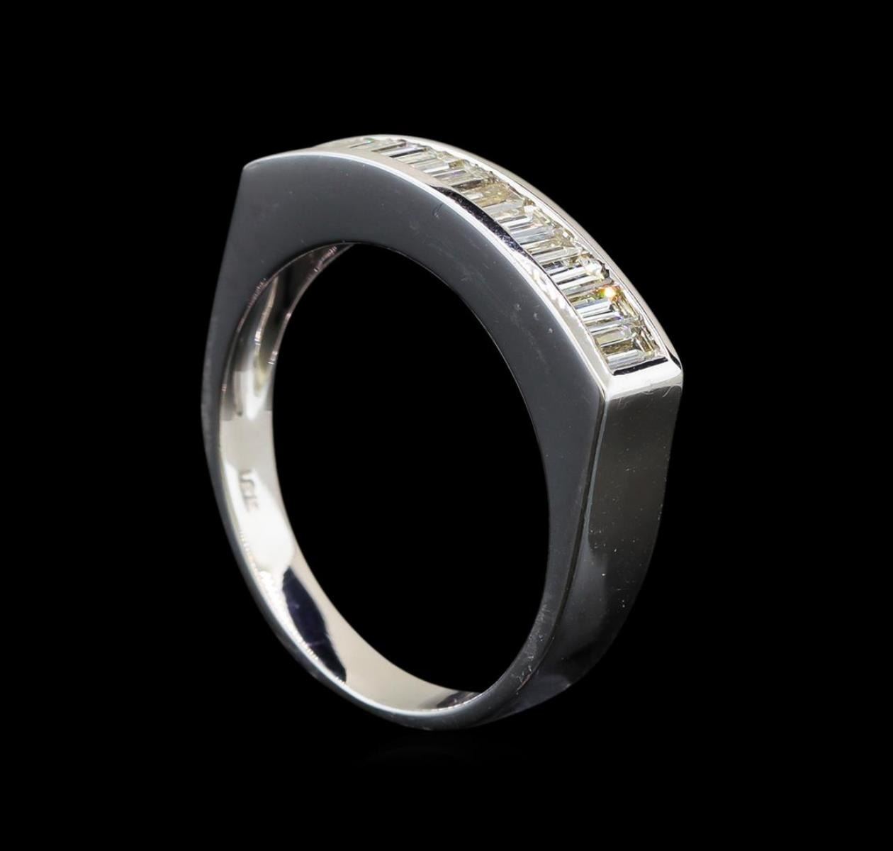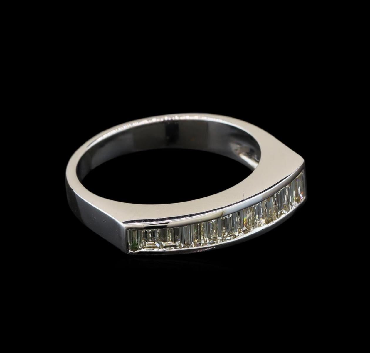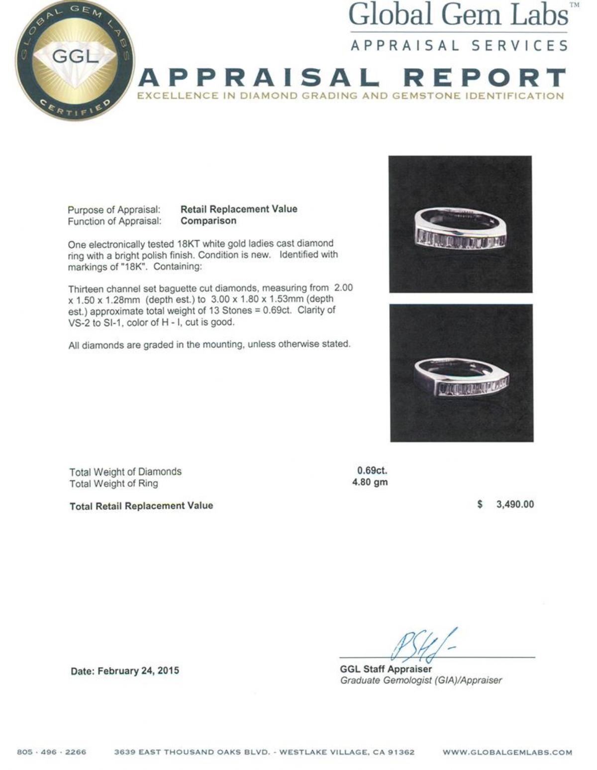 One electronically tested 18KT white gold ladies cast diamond ring with a bright polish finish. Identified with markings of "18K". Condition is new. Containing: Thirteen channel set baguette cut diamonds, measuring from 2.00 x 1.50 x 1.28mm (depth est.) to 3.00 x 1.80 x 1.53mm (depth est.) approximate total weight of 13 Stones = 0.69ct. Clarity: VS-2 to SI-1. Color: H - I, Cut is Good. All diamonds are graded in the mounting, unless otherwise stated. Total Weight of Diamonds 0.69ct. Total Weight of Ring 4.80 grams. GGL Appraised.