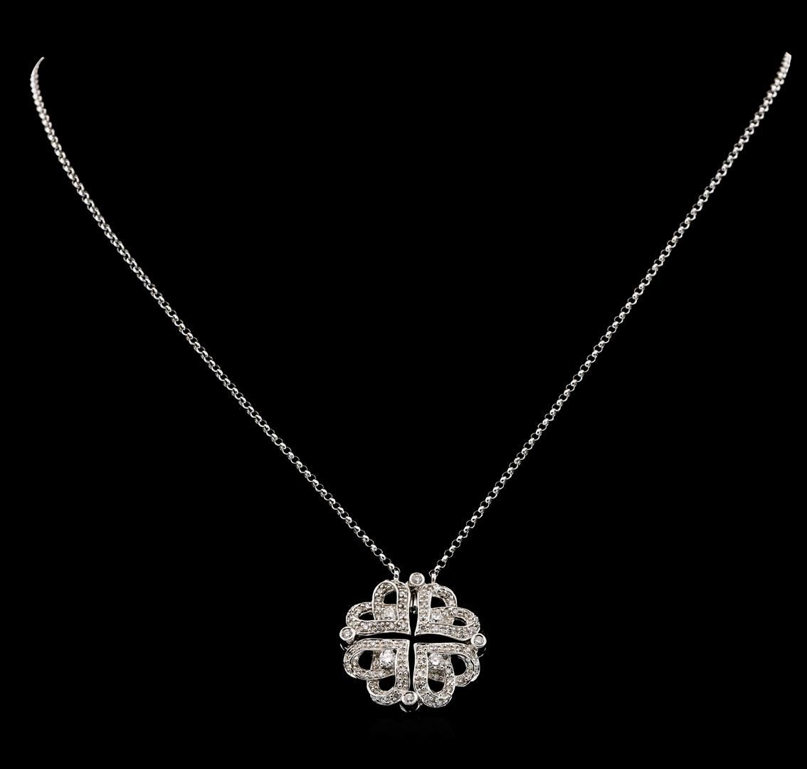 One electronically tested 18KT white gold lady's combination cast & assembled fashion necklace with a spring ring clasp with a bright polish finish. The featured lady's necklace has a 1.5 millimeter thick rolo chain measuring approximately seventeen inches in length. The necklace is convertible and can be worn as a clover motif or a chain of hearts motif. Identified with markings of "18K". Condition is new, good workmanship. Containing: Four prong set round brilliant cut diamonds, measuring 2.80 - 2.70 x 1.70mm (depth est.) approximate total weight of 4 Stones = 0.32ct. Graded in the setting. Clarity: VS-2 to SI-1. Color: H - ICut Good Four bezel set round brilliant cut diamonds, measuring 1.90 - 1.80 x 1.15mm (depth est.) approximate total weight of 4 Stones = 0.10ct. Graded in the setting. Clarity: SI-1 to SI-2. Color: H - ICut Good Seventy-Two prong set round brilliant cut diamonds, measuring 1.10 - 1.00 x 0.65mm (depth est.) approximate total weight of 72 Stones = 0.31ct. Graded in the setting. Clarity: SI-1 to I-1. Color: H - ICut Good. Total Weight of Diamonds 0.73ct. Total Weight of Necklace 10.30gm. GAS Appraised.