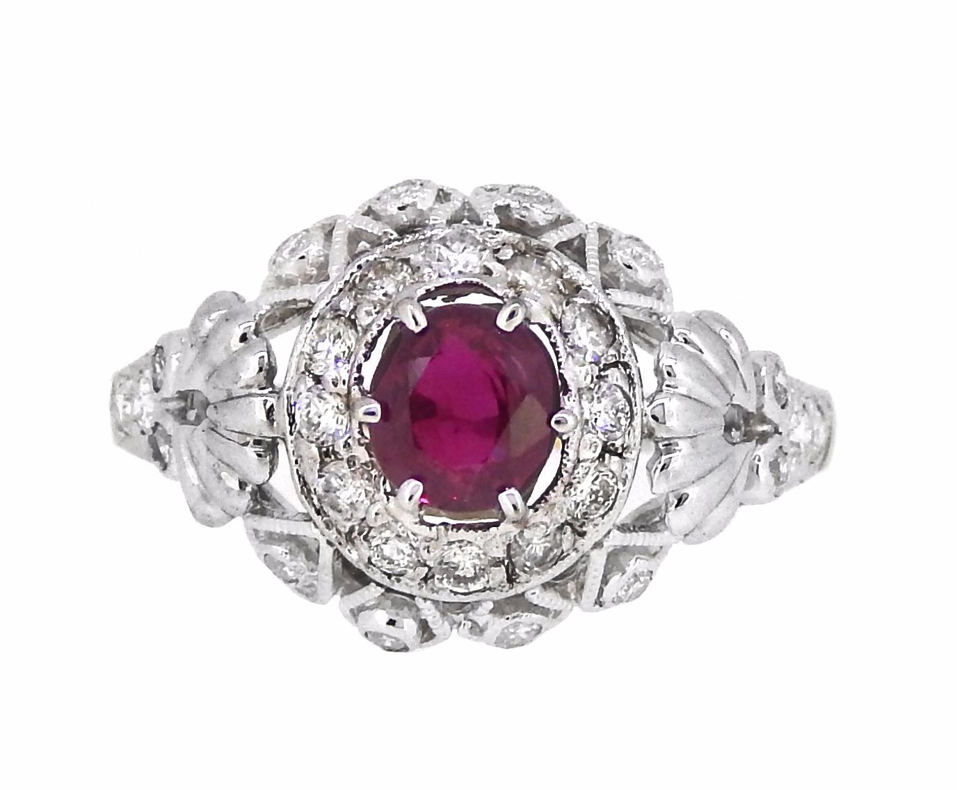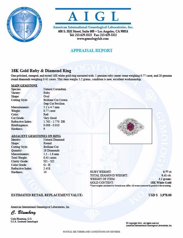 One 18KT White Gold 0.77ct Ruby and Diamond Ring. (1) Ruby with a total weight of 0.77cts. (28) Diamonds with a total weight of 0.41cts with a color of G-H and clarity of SI-1 to SI-2. Total weight of this ring is 3.2 grams.
