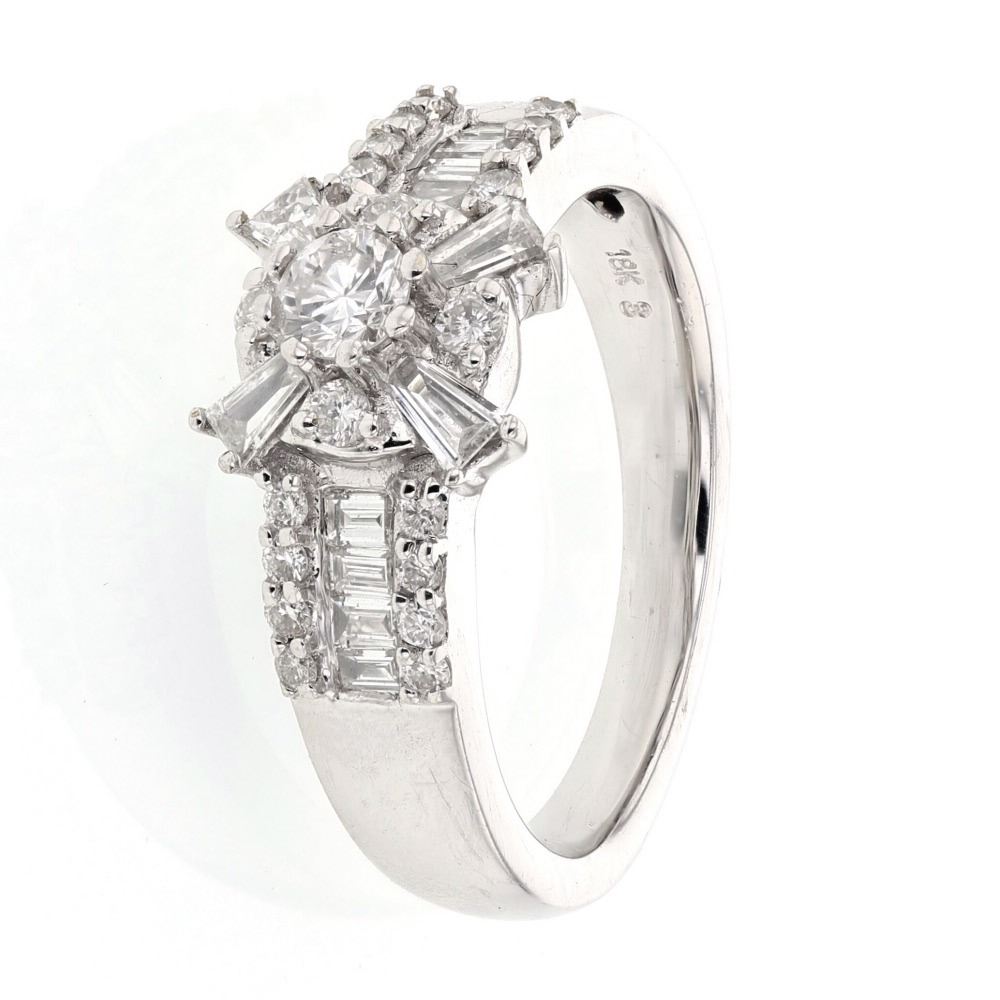 One 18KT White Gold 0.86ctw Diamond Ring. (1) Round center Diamond with a total weight of 0.21cts with a color of I and clarity of I-1. (12) Baguette Diamonds with a total weight of 0.42cts with a color of I and clarity of I-1. (20) round Diamonds with a total weight of 0.23cts with a color of G-H and clarity of SI-2. Total weight of this ring is 6.22 grams.