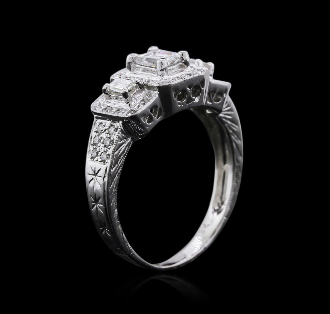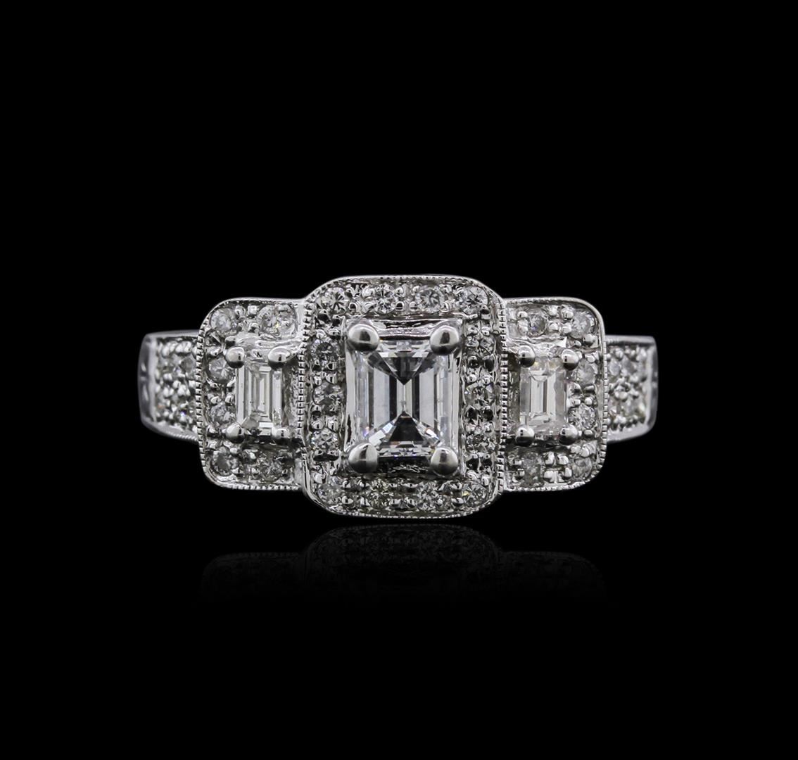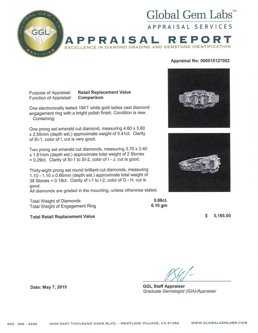 One electronically tested 18KT white gold ladies cast diamond engagement ring with a bright polish finish. Condition is new. Containing: One prong set emerald cut diamond, measuring 4.60 x 3.80 x 2.55mm (depth est.) approximate weight of 0.41ct. Clarity: SI-1. Color: I, Cut is Very Good. Two prong set emerald cut diamonds, measuring 3.70 x 2.40 x 1.61mm (depth est.) approximate total weight of 2 Stones = 0.29ct. Clarity: SI-1 to SI-2. Color: I - J, Cut is Good. Thirty-Eight prong set round brilliant cut diamonds, measuring 1.10 - 1.10 x 0.66mm (depth est.) approximate total weight of 38 Stones = 0.18ct. Clarity: I-1 to I-2. Color: G - H, Cut is Good. All diamonds are graded in the mounting, unless otherwise stated. Total Weight of Diamonds 0.88ct. Total Weight of Engagement Ring 6.10 grams. GGL Appraised at $5,165.00.