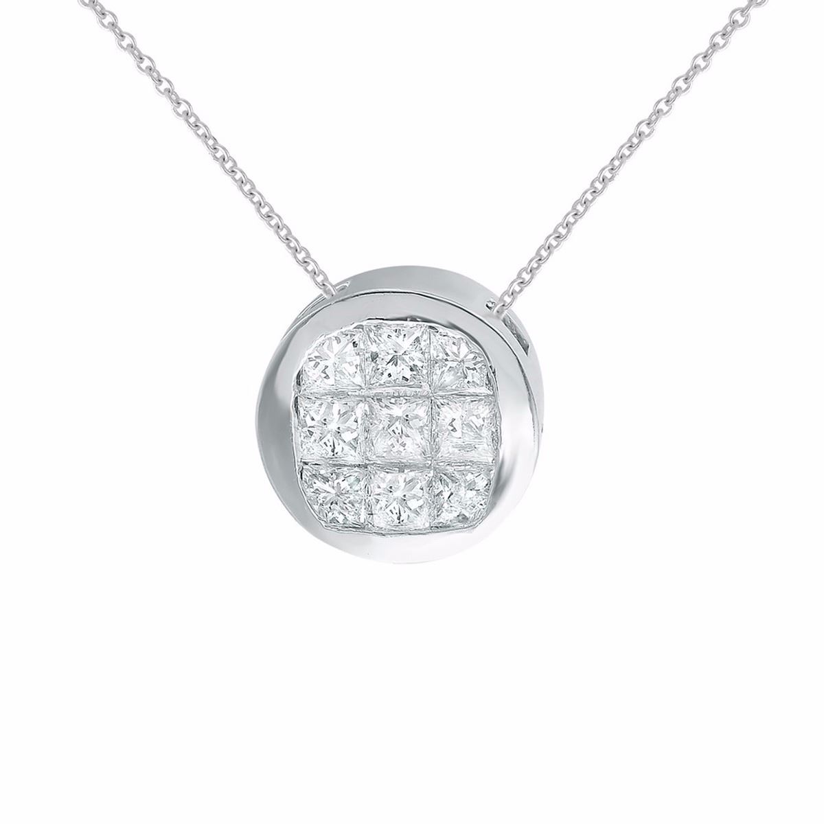 One 18KT White Gold 0.89ctw Diamond Pendant with Chain. (9) Diamonds with a total weight of 0.89cts. The total weight of this pendant with chain is 3.1 grams.