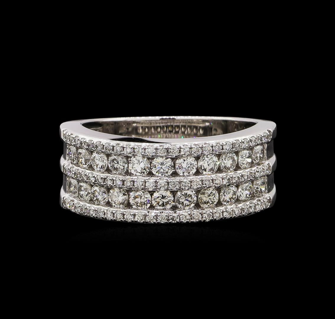 One electronically tested 18KT white gold ladies cast diamond ring with a bright polish finish. Identified with markings of "750". Condition is new. Containing: Twenty-Two channel set round brilliant cut diamonds, measuring 2.00 - 2.00 x 1.20mm (depth est.) approximate total weight of 22 Stones = 0.64ct. Clarity: SI-1 to I-1. Color: I - J, Cut is Good. Seventy-Five prong set round brilliant cut diamonds, measuring 1.00 - 1.00 x 0.60mm (depth est.) approximate total weight of 75 Stones = 0.27ct. Clarity: SI-1 to I-1. Color: I - J, Cut is Good. All diamonds are graded in the mounting, unless otherwise stated. Total Weight of Diamonds 0.91ct. Total Weight of Ring 6.40 grams. GGL Appraised at $4,070.00.