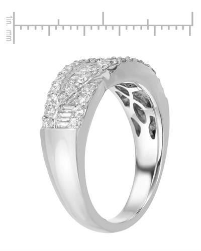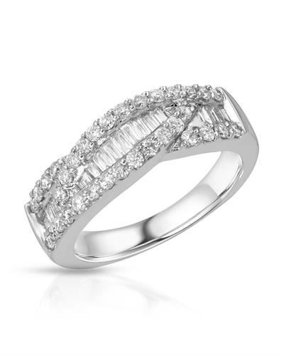 One 18KT White Gold 0.93ctw Diamond Ring. (15) Baguette Diamonds with a total weight of 0.34cts with a color of I and clarity of I-1. (34) round Diamonds with a total weight of 0.59cts with a color of G-H and clarity of SI-2. Total weight of this ring is 7.55 grams.