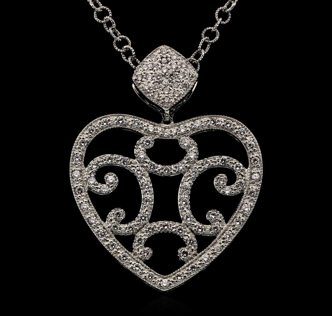 One electronically tested 18KT white gold lady's combination cast & assembled fashion heart shape pendant & chain 18.0" long, 2.8mm twisted circle cable link with a tongue clasp with foldover safety with a bright polish with milgrain detailing finish. Identified with markings of "750". Condition is new, good workmanship. Containing: Seventy-Four prong set round brilliant cut diamonds, measuring 1.50 - 1.40 x 0.90mm (depth est.) approximate total weight of 74 Stones = 0.85ct. Graded in the setting. Clarity: VS-2 to SI-1. Color: G - HCut Very Good Twenty-Four prong set round brilliant cut diamonds, measuring 1.20 - 1.10 x 0.71mm (depth est.) approximate total weight of 24 Stones = 0.15ct. Graded in the setting. Clarity: VS-2 to SI-1. Color: H - ICut Good. Total Weight of Diamonds 1.00ct. Total Weight of Pendant & Chain 12.90gm. GAS Appraised.