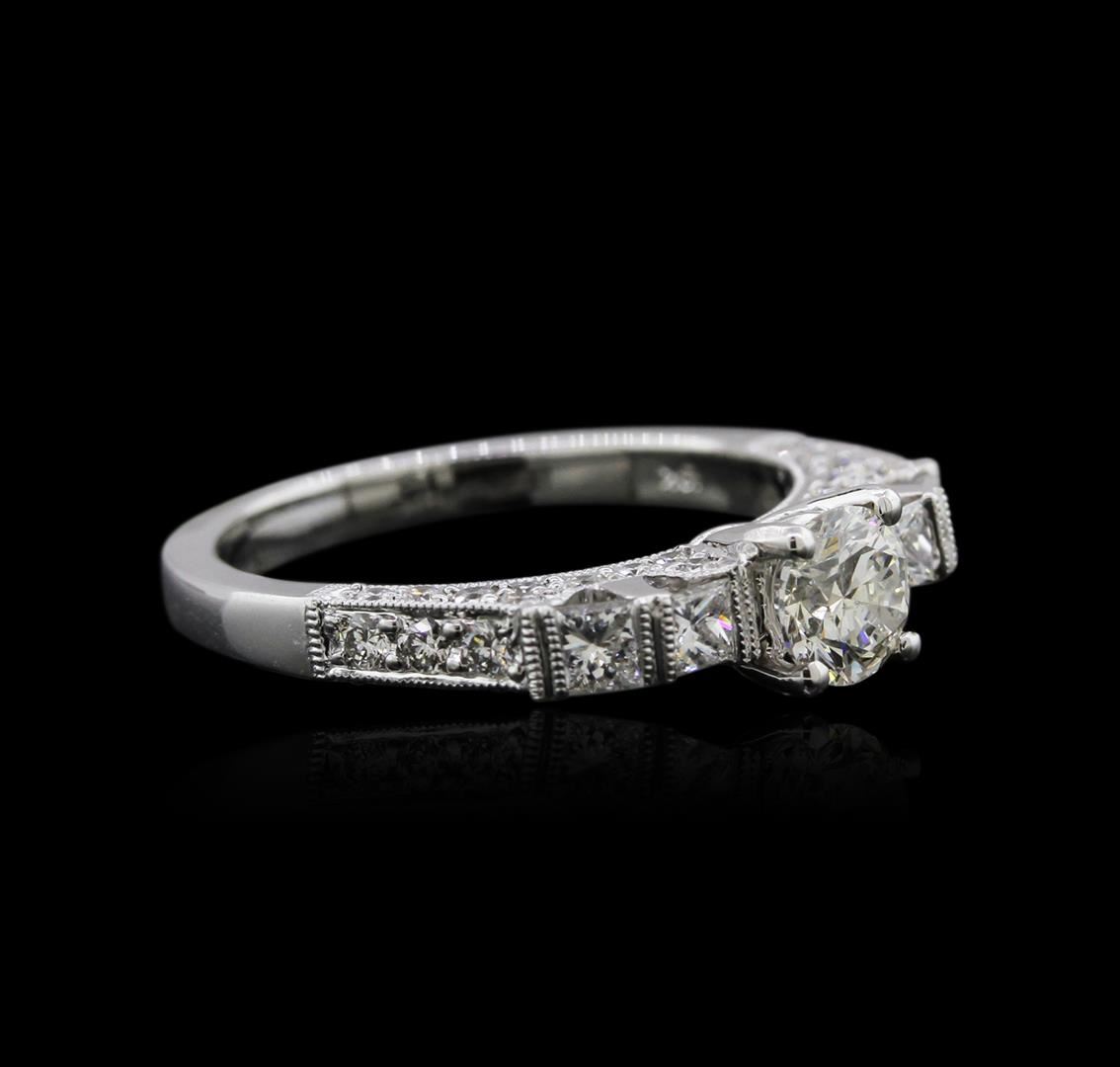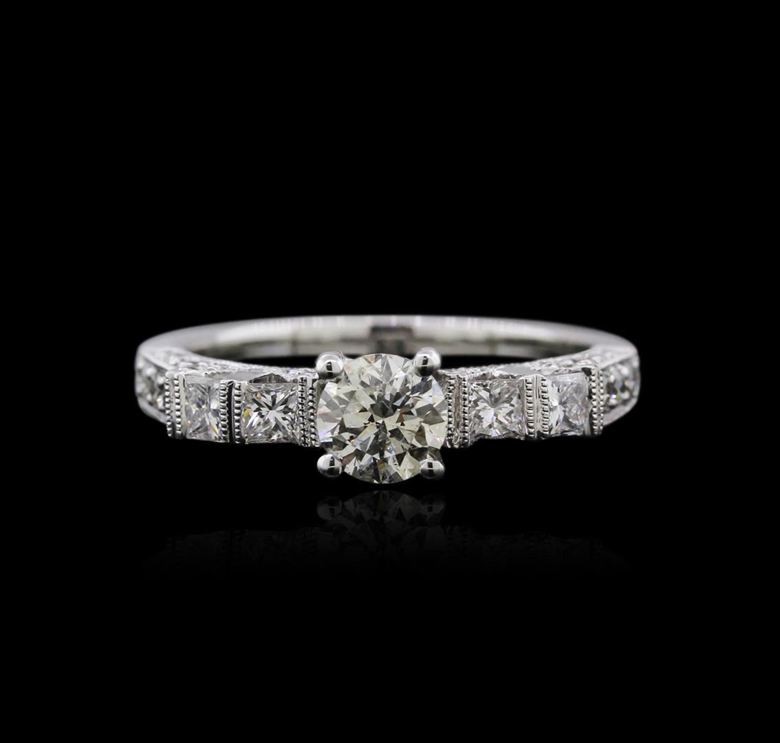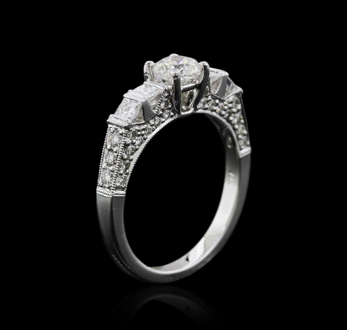 One electronically tested 18KT white gold ladies cast diamond engagement ring with a bright polish finish. Identified with markings of "18K". Condition is new. Containing: One prong set round brilliant cut diamond, measuring 5.20 - 5.20 x 3.25mm (depth est.) approximate weight of 0.54ct. Clarity: SI-2. Color: J, Cut is Good. Two prong set round brilliant cut diamonds, measuring 3.00 - 3.00 x 1.80mm (depth est.) approximate total weight of 2 Stones = 0.20ct. Clarity: SI-1. Color: H - I, Cut is Good. Thirty prong set round brilliant cut diamonds, measuring 1.50 - 1.20 x 0.81mm (depth est.) approximate total weight of 30 Stones = 0.27ct. Clarity: SI-1. Color: I - J, Cut is Good. All diamonds are graded in the mounting, unless otherwise stated. Total Weight of Diamonds 1.00ct. Total Weight of Engagement Ring 4.30 grams. GGL Appraised at $4,795.00.