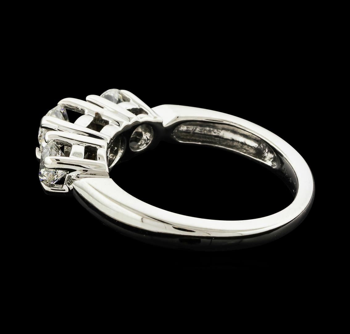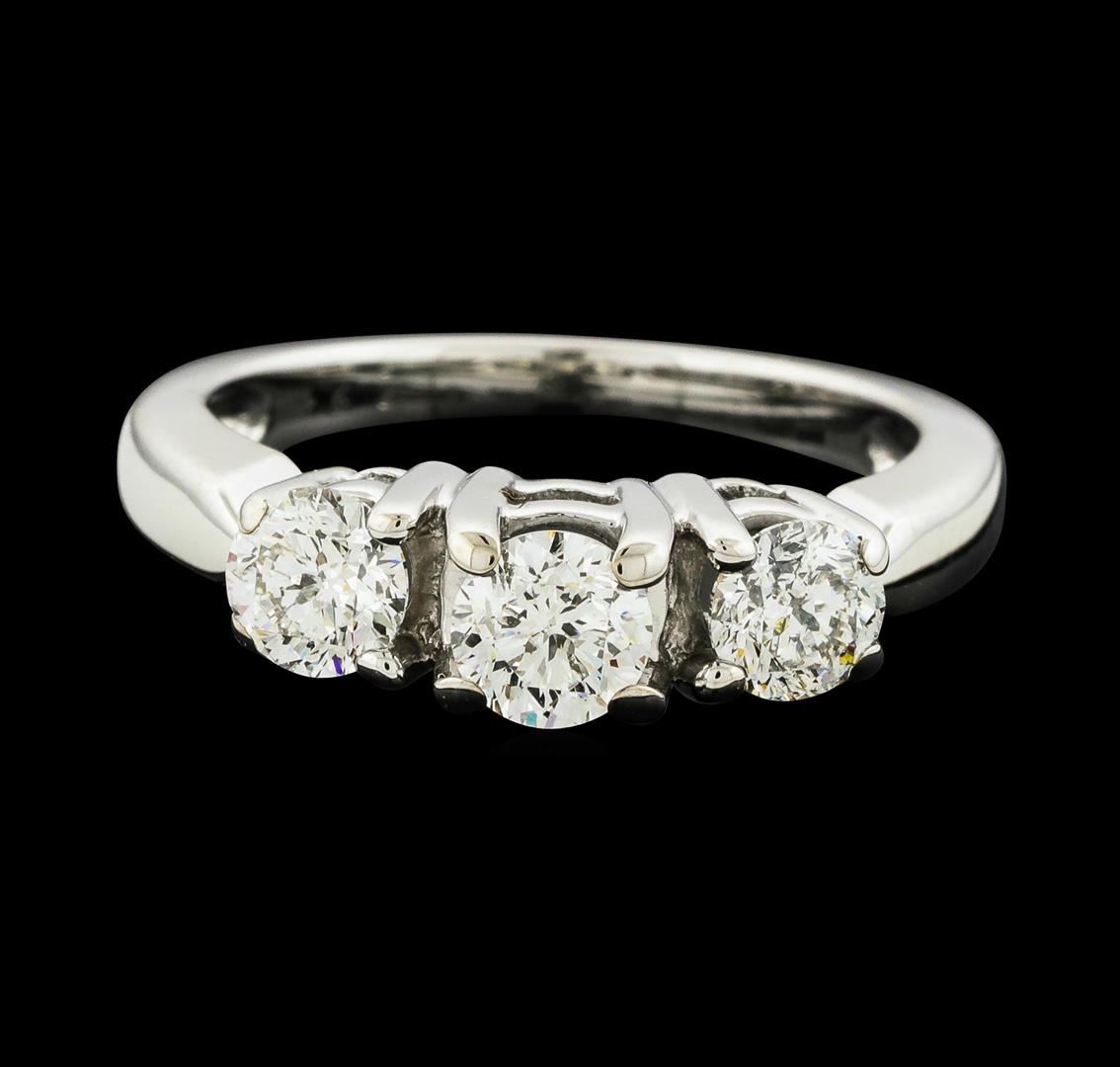 One electronically tested 18KT white gold lady's cast 3-stone ring with a bright polish finish. The featured lady's ring has a shank measuring 2.10 millimeters wide. Identified with markings of "18K". Condition is like new, good workmanship. Containing: Three prong set round brilliant cut diamonds, measuring 4.61 - 4.31 x 2.77mm (depth est.) approximate total weight of 3 Stones = 1.00ct. Graded in the setting. Clarity: VS-2 to SI-1. Color: H - ICut Very Good. Total Weight of Diamonds 1.00ct. Total Weight of Ring 5.10gm. GAS Appraised.