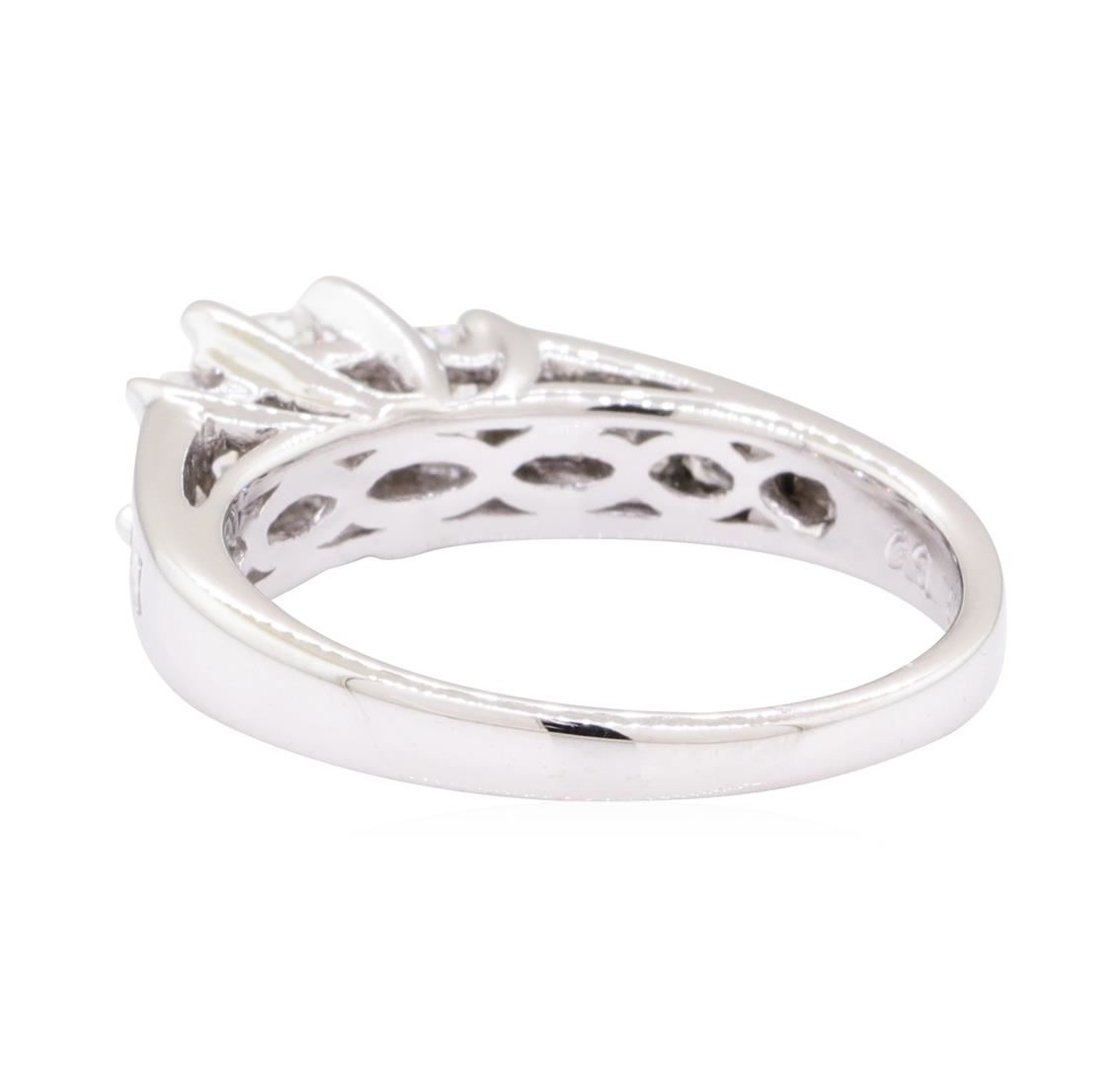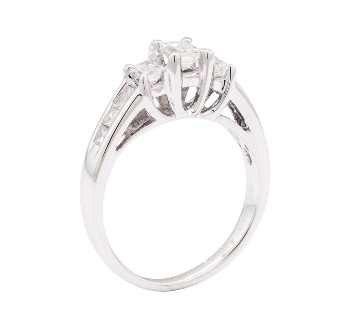 One electronically tested 18KT white gold lady's cast fashion ring with a cathedral straight line with a bright polish finish. The featured lady's ring has a shank measuring 2.20 millimeters wide. Identified with markings of '18K'. Condition is like new, good workmanship. Containing: One prong set emerald cut diamond, measuring 4.25 x 3.08 x 2.44mm (depth est.) approximate weight of 0.30ct. Graded in the setting. Color F - G, Clarity VS-1 Cut Excellent Two prong set emerald cut diamonds, measuring 3.70 x 2.55 x 1.71mm (depth est.) approximate total weight of 2 Stones = 0.30ct. Graded in the setting. Color F - G, Clarity VS-1 to VS-2 Cut Good Six channel set princess cut diamonds, measuring 2.50 x 2.00 x 1.50mm (depth est.) approximate total weight of 6 Stones = 0.40ct. Graded in the setting. Color G - H, Clarity VS-2 to SI-2, Cut Very Good. Total Weight of Diamonds 1.00ct. Total Weight of Ring 4.60gm. GAS Appraised.