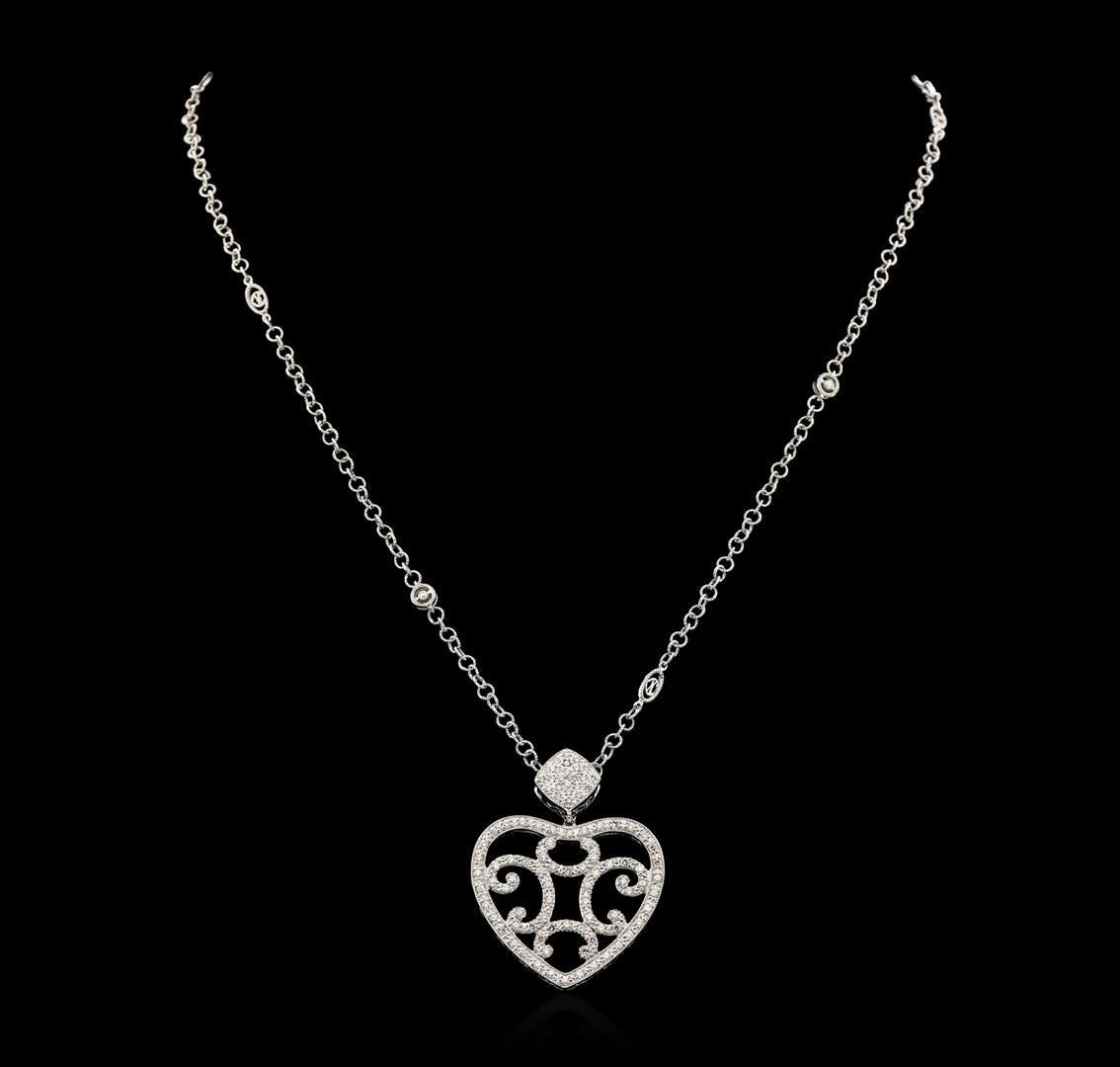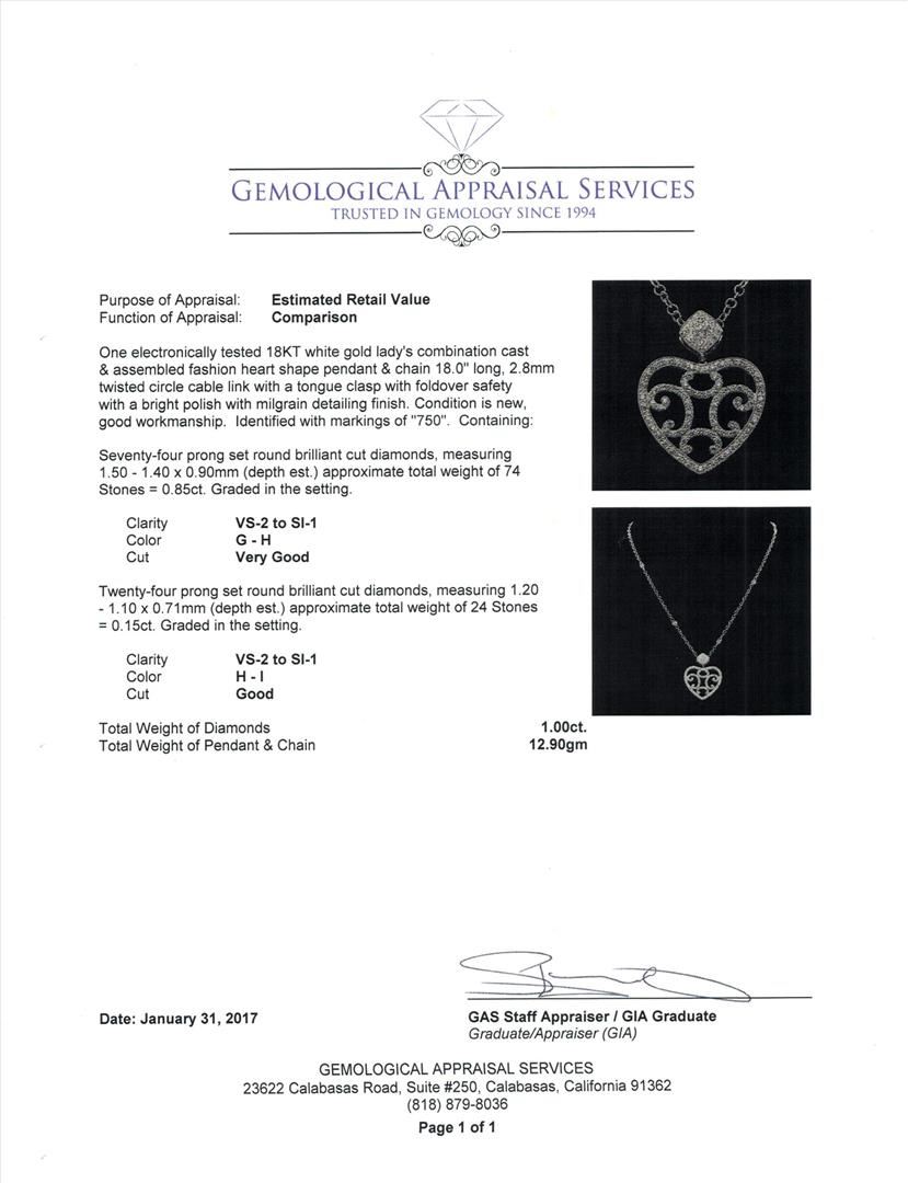 One electronically tested 18KT white gold lady's combination cast & assembled fashion heart shape pendant & chain 18.0" long, 2.8mm twisted circle cable link with a tongue clasp with foldover safety with a bright polish with milgrain detailing finish. Identified with markings of "750". Condition is new, good workmanship. Containing: Seventy-Four prong set round brilliant cut diamonds, measuring 1.50 - 1.40 x 0.90mm (depth est.) approximate total weight of 74 Stones = 0.85ct. Graded in the setting. Clarity: VS-2 to SI-1. Color: G - HCut Very Good Twenty-Four prong set round brilliant cut diamonds, measuring 1.20 - 1.10 x 0.71mm (depth est.) approximate total weight of 24 Stones = 0.15ct. Graded in the setting. Clarity: VS-2 to SI-1. Color: H - ICut Good. Total Weight of Diamonds 1.00ct. Total Weight of Pendant & Chain 12.90gm. GAS Appraised.