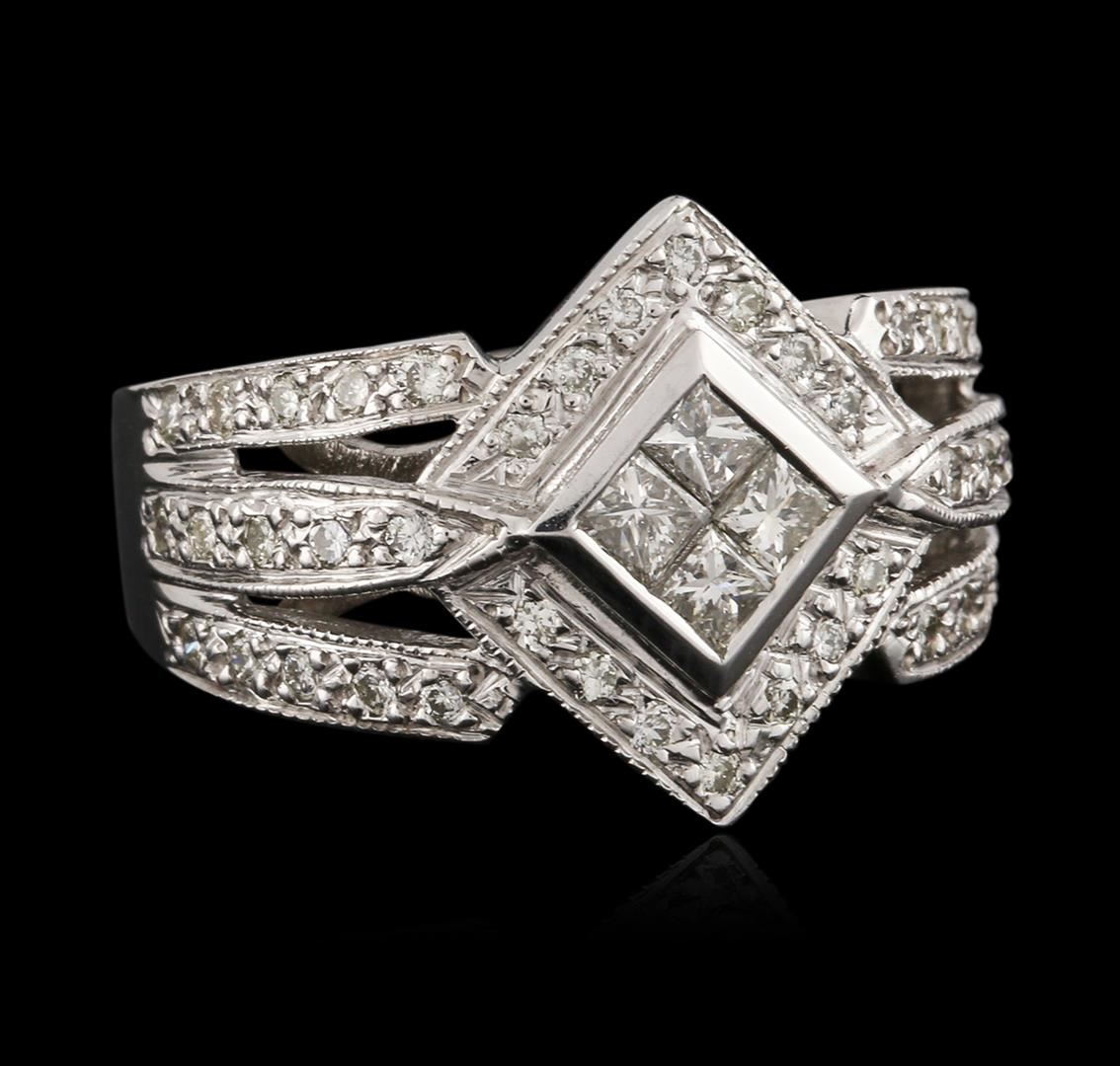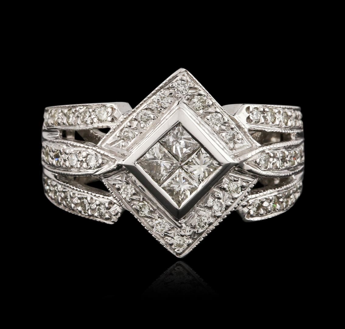 One ring featuring: 18KT white gold weighing 9.40 grams containing pave set diamonds and invisible set princess cut diamonds with a total weight of 1.00ct.