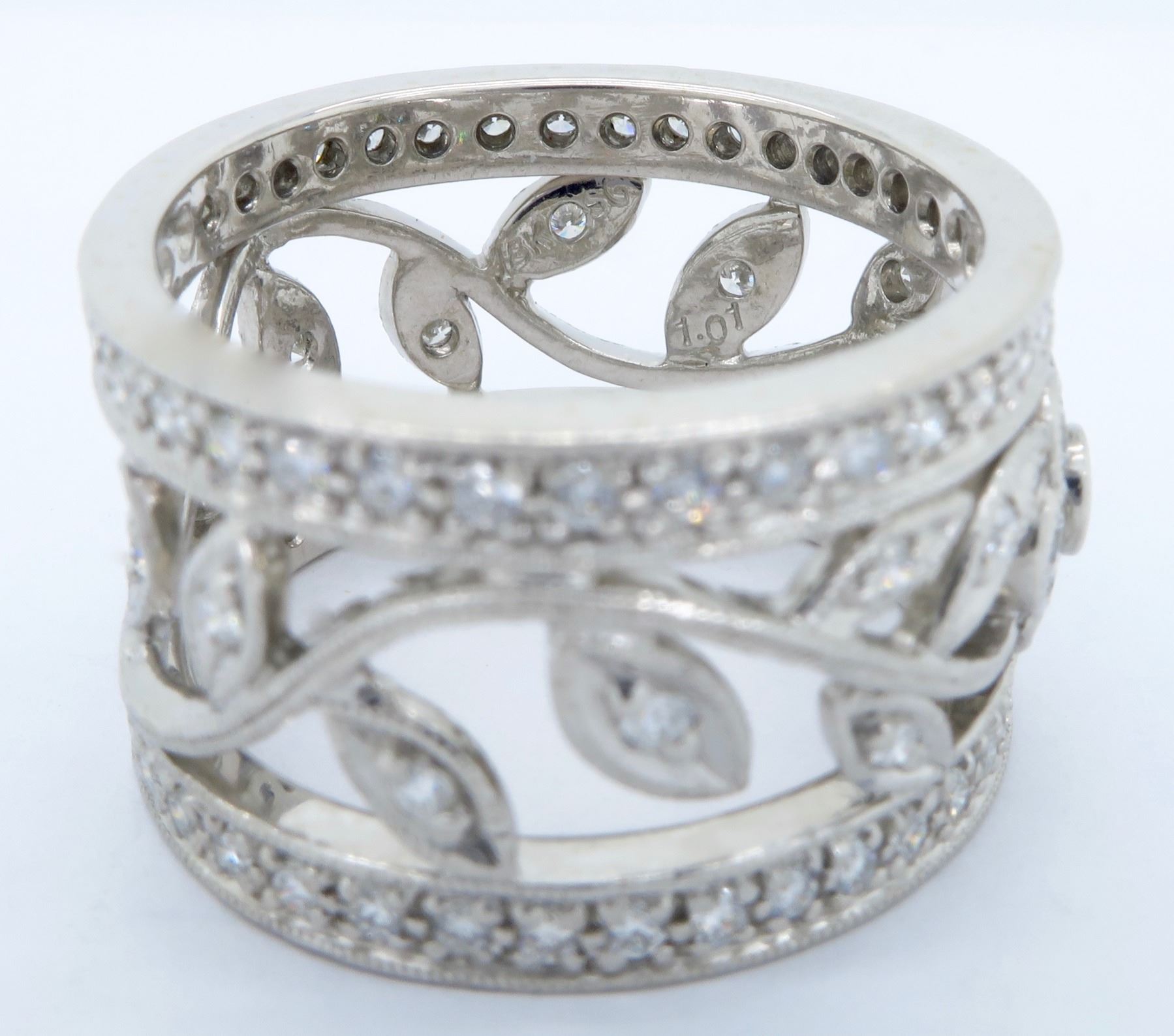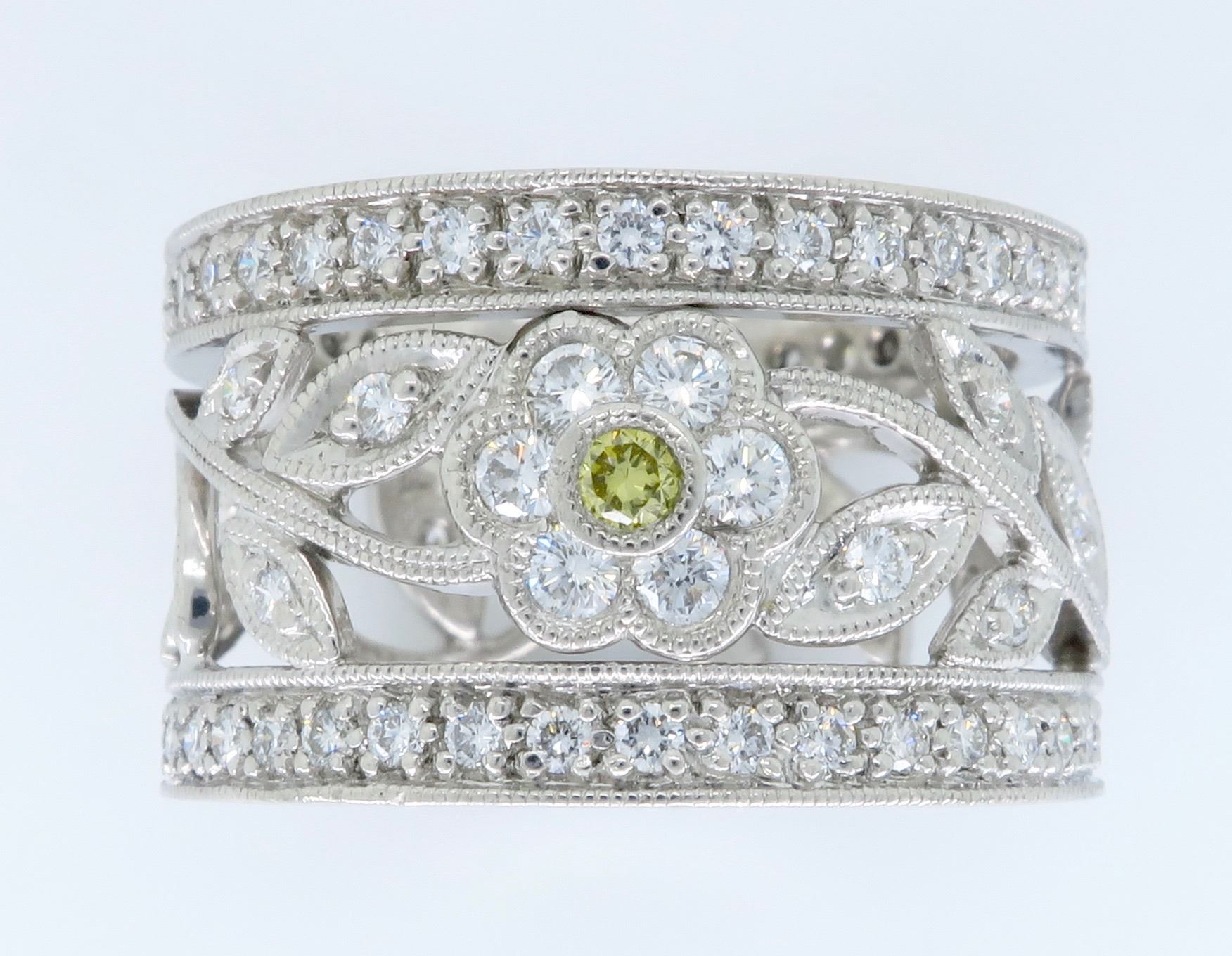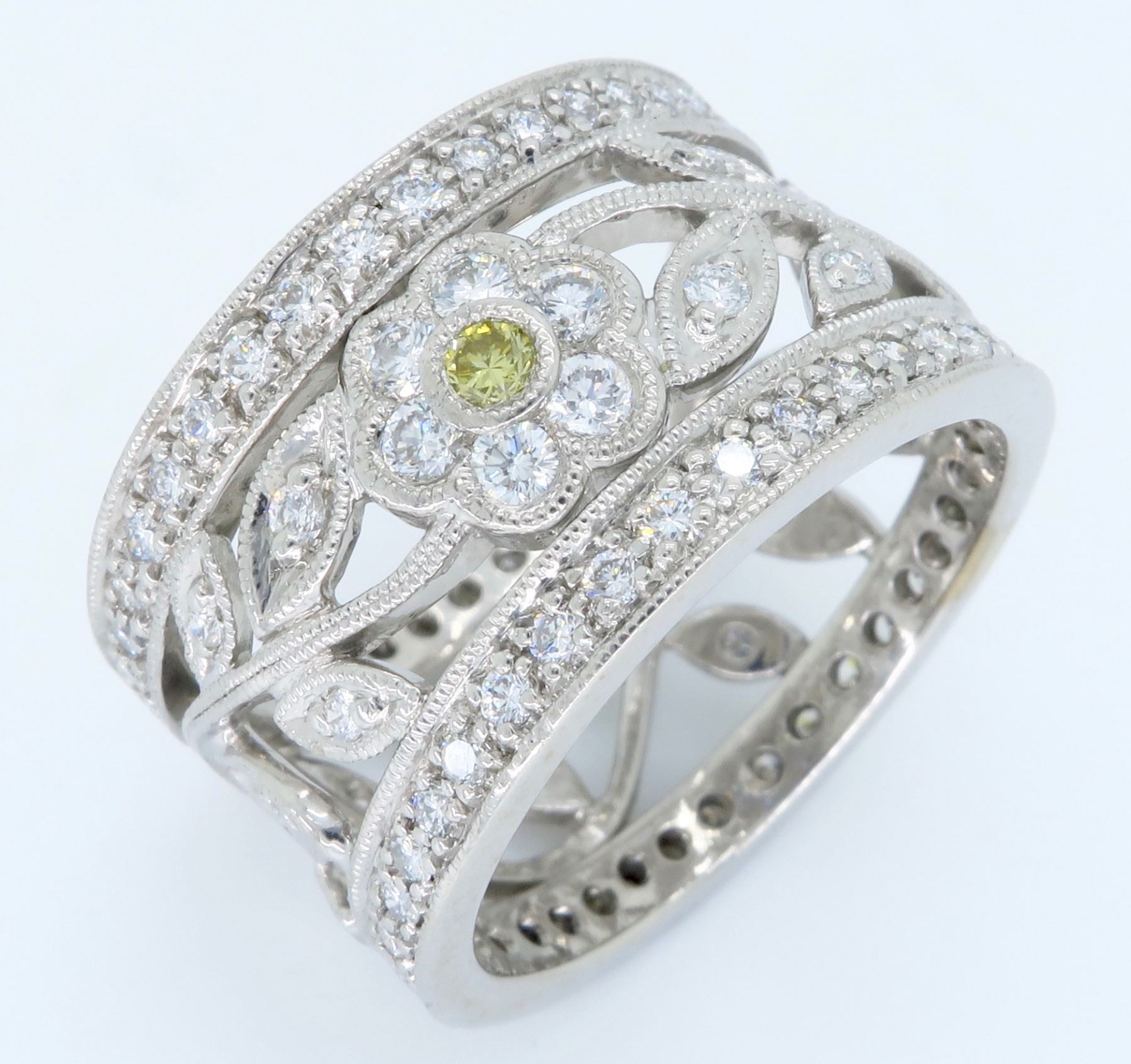 One 18KT White Gold 1.01ctw Diamond Ring. (1) yellow and (59) white Diamonds with a total weight of 1.01cts with a color of G-J and clarity of VS-2 to SI-1. Total weight of this ring is 9.9 grams. Ring size is 6.25.