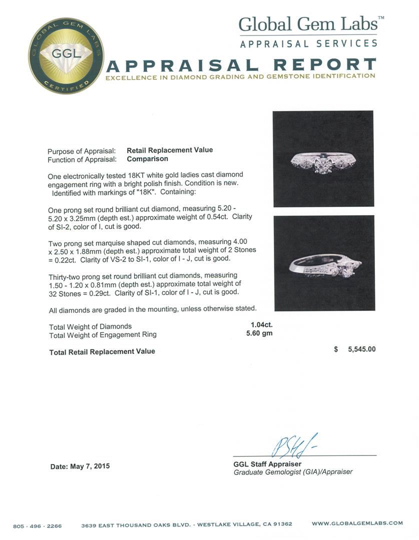 One electronically tested 18KT white gold ladies cast diamond engagement ring with a bright polish finish. Identified with markings of "18K". Condition is new. Containing: One prong set round brilliant cut diamond, measuring 5.20 - 5.20 x 3.25mm (depth est.) approximate weight of 0.54ct. Clarity: SI-2. Color: I, Cut is Good. Two prong set marquise shaped cut diamonds, measuring 4.00 x 2.50 x 1.88mm (depth est.) approximate total weight of 2 Stones = 0.22ct. Clarity: VS-2 to SI-1. Color: I - J, Cut is Good. Thirty-Two prong set round brilliant cut diamonds, measuring 1.50 - 1.20 x 0.81mm (depth est.) approximate total weight of 32 Stones = 0.29ct. Clarity: SI-1. Color: I - J, Cut is Good. All diamonds are graded in the mounting, unless otherwise stated. Total Weight of Diamonds 1.04ct. Total Weight of Engagement Ring 5.60 grams. GGL Appraised at $5,545.00.