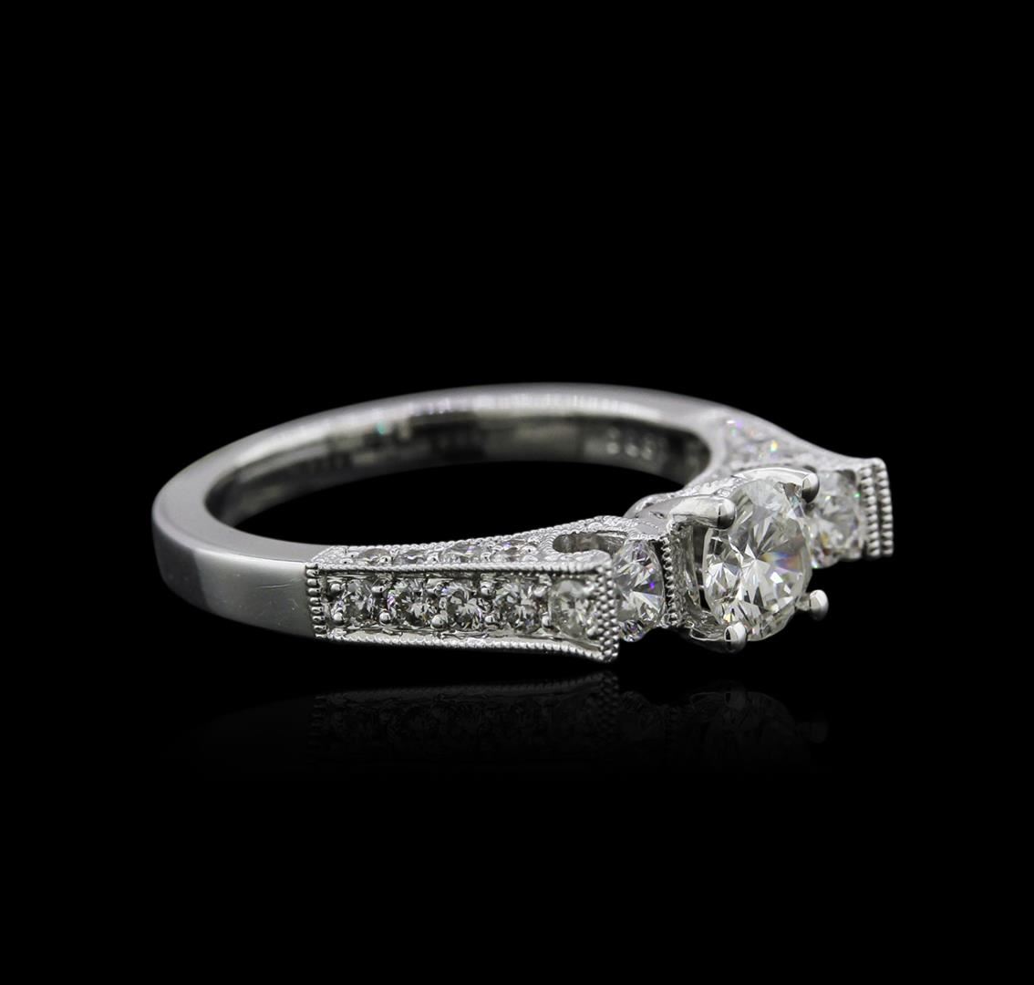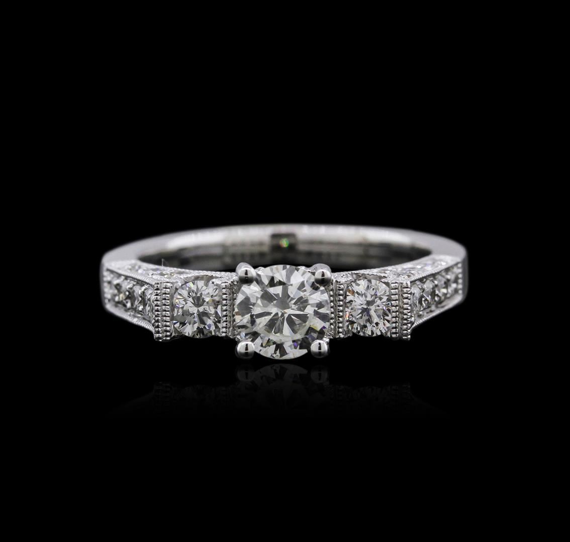 One electronically tested 18KT white gold ladies cast diamond engagement ring with a bright polish finish. Identified with markings of "18K". Condition is new. Containing: One prong set round brilliant cut diamond, measuring 5.30 - 5.30 x 3.31mm (depth est.) approximate weight of 0.57ct. Clarity: SI-2. Color: G, Cut is Good. Two prong set round brilliant cut diamonds, measuring 3.00 - 3.00 x 1.80mm (depth est.) approximate total weight of 2 Stones = 0.20ct. Clarity: SI-1. Color: H - I, Cut is Good. Thirty prong set round brilliant cut diamonds, measuring 1.50 - 1.20 x 0.81mm (depth est.) approximate total weight of 30 Stones = 0.27ct. Clarity: SI-1. Color: I - J, Cut is Good. All diamonds are graded in the mounting, unless otherwise stated. Total Weight of Diamonds 1.04ct. Total Weight of Engagement Ring 5.00 grams. GGL Appraised at $7,665.00.